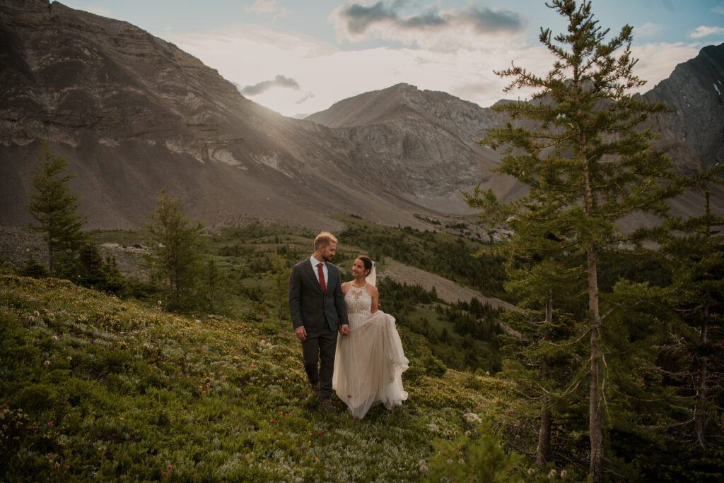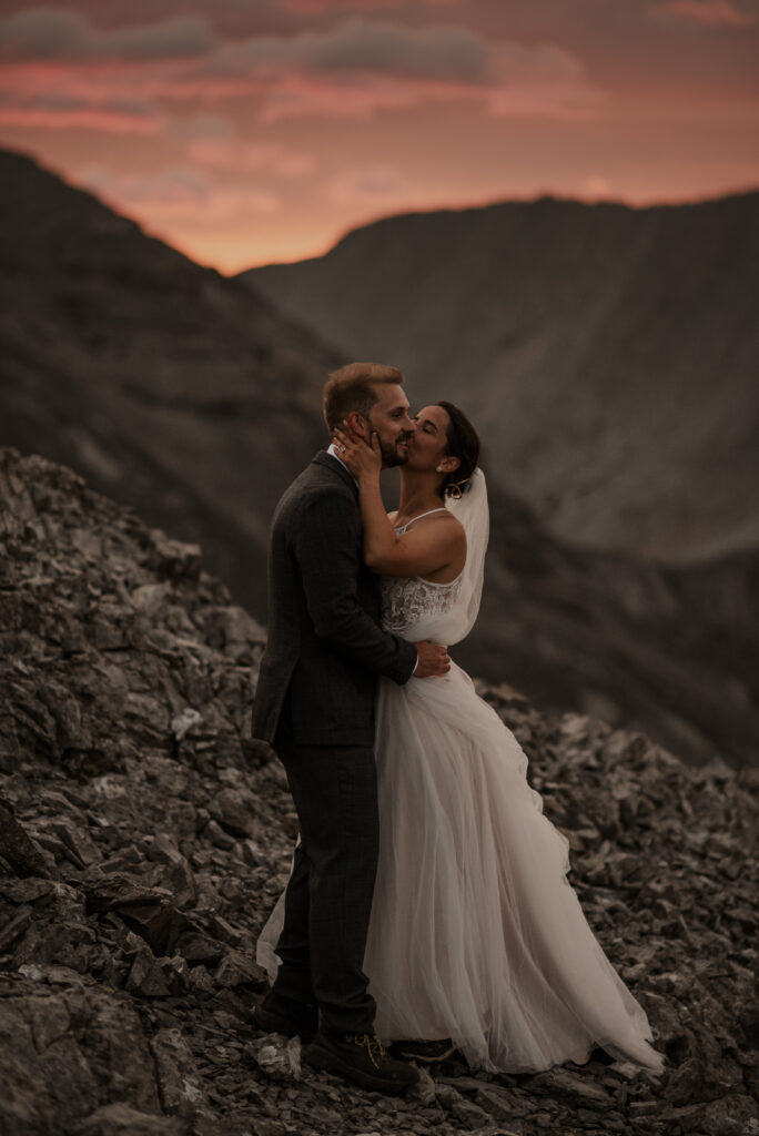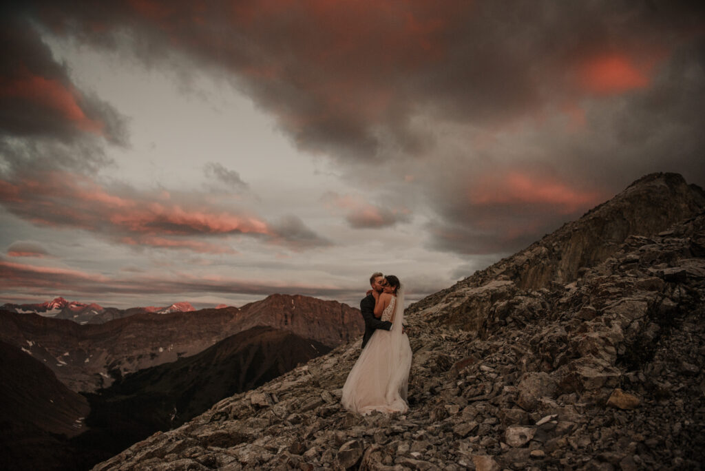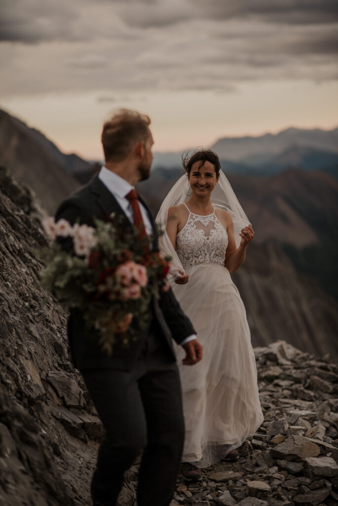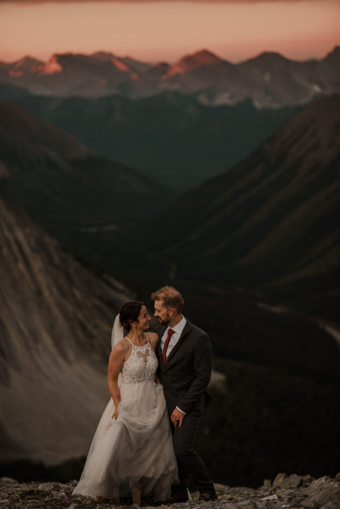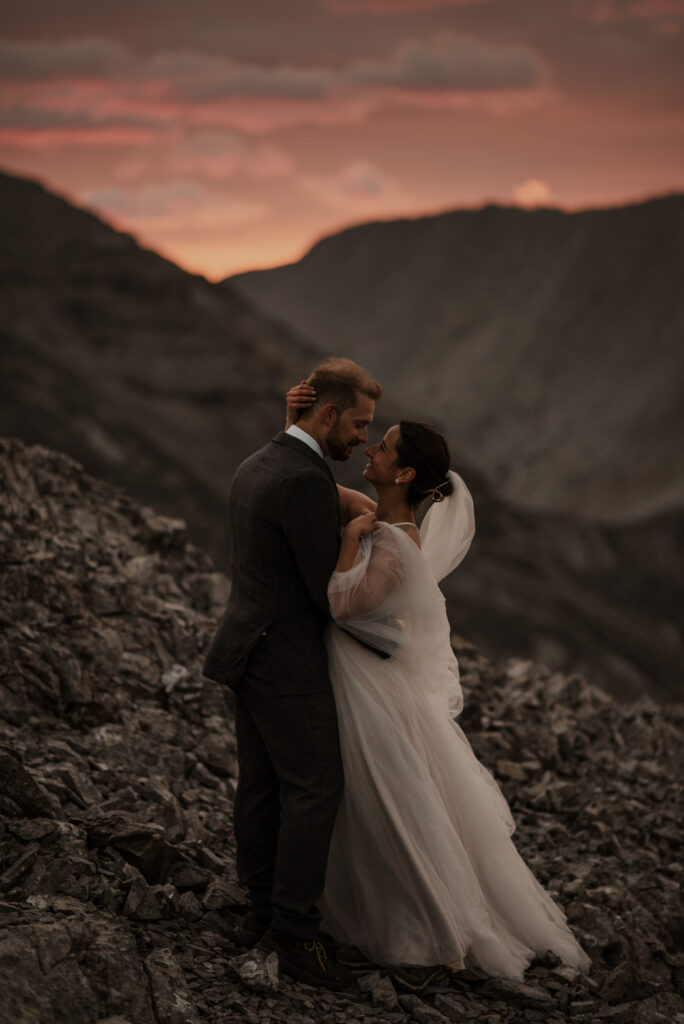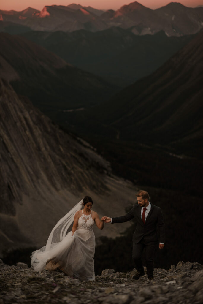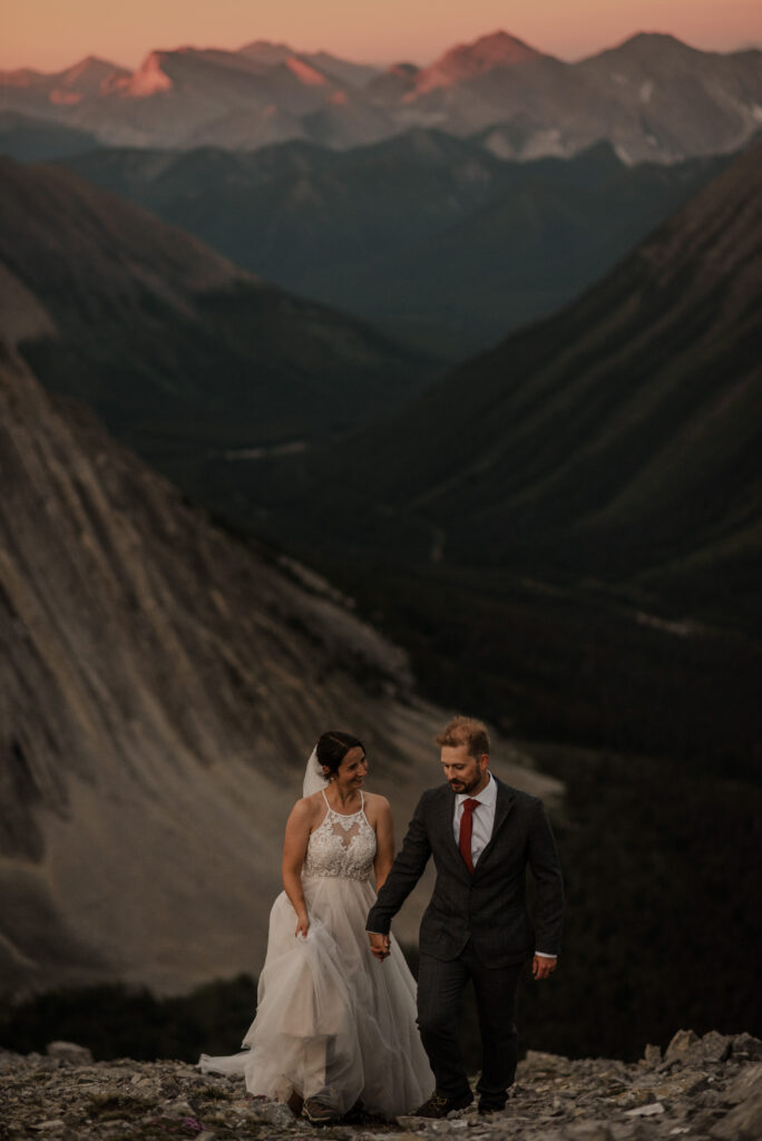 This is a great example of a perfect timeline for a hiking elopement if you want to also include guests. Do the sunrise hike and private vows first, then meet family later for a little ceremony on the ground. Have a look at these epic photos from this hiking elopement in Kananaskis!