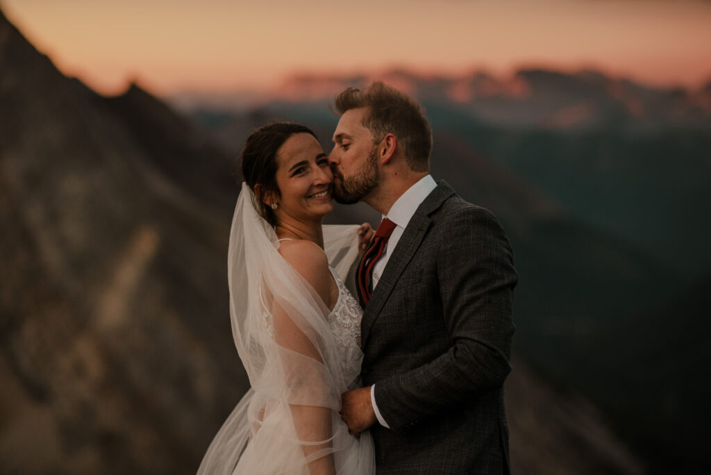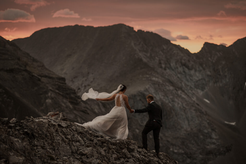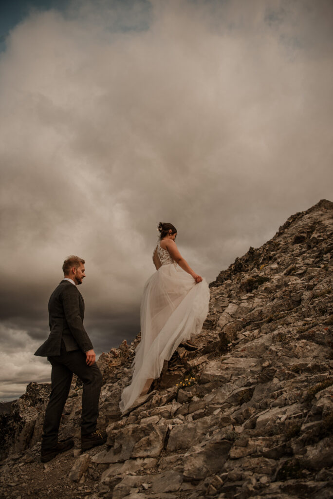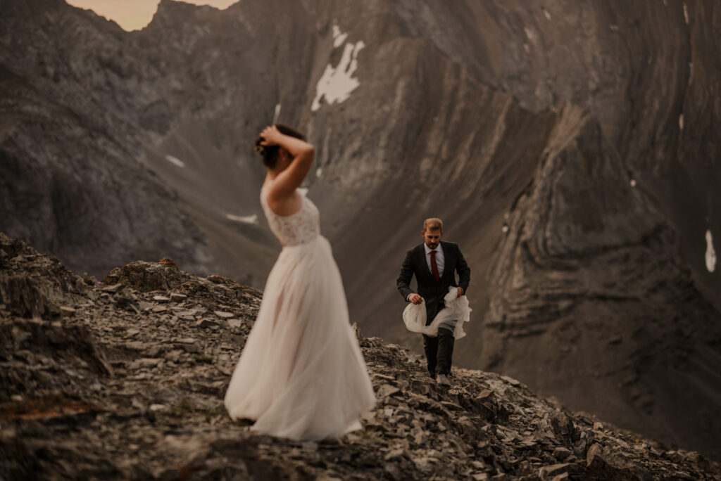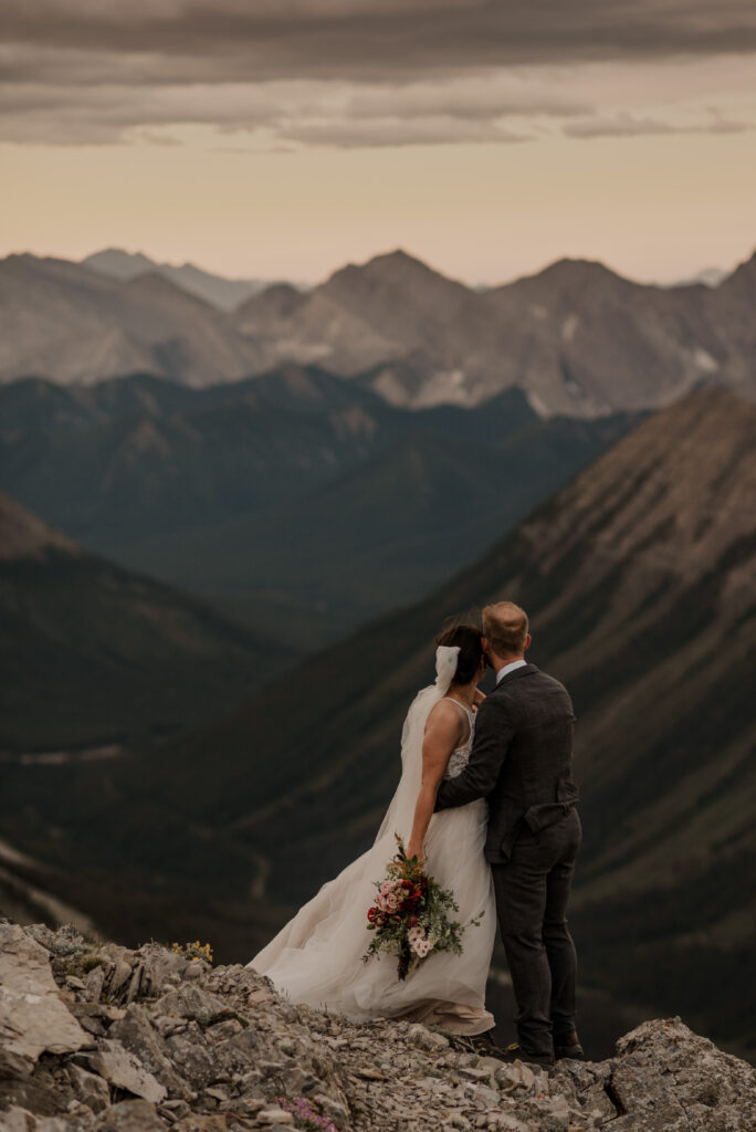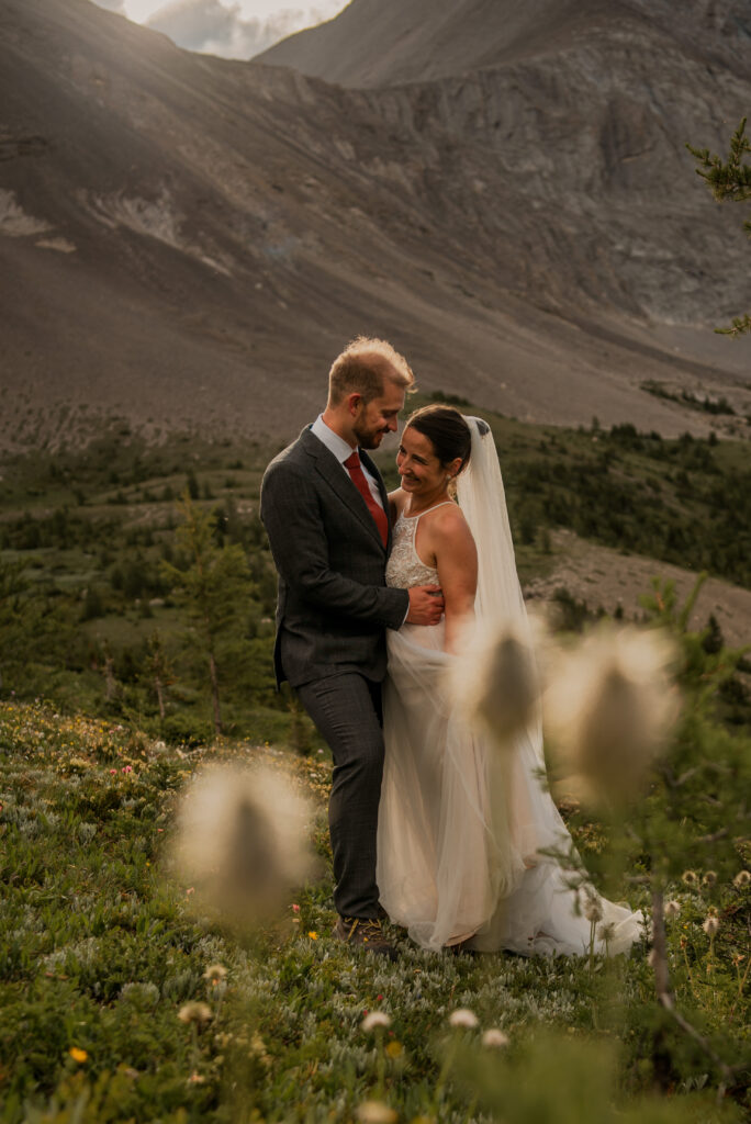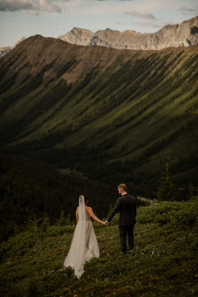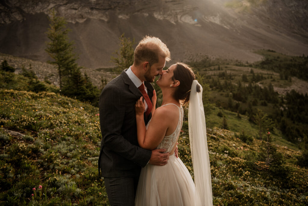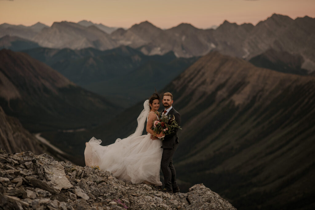 This is a great example of a perfect timeline for a hiking elopement if you want to also include guests. Do the sunrise hike and private vows first, then meet family later for a little ceremony on the ground. Have a look at these epic photos from this hiking elopement in Kananaskis!