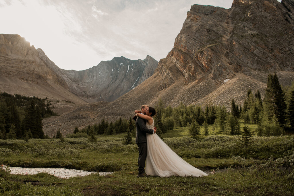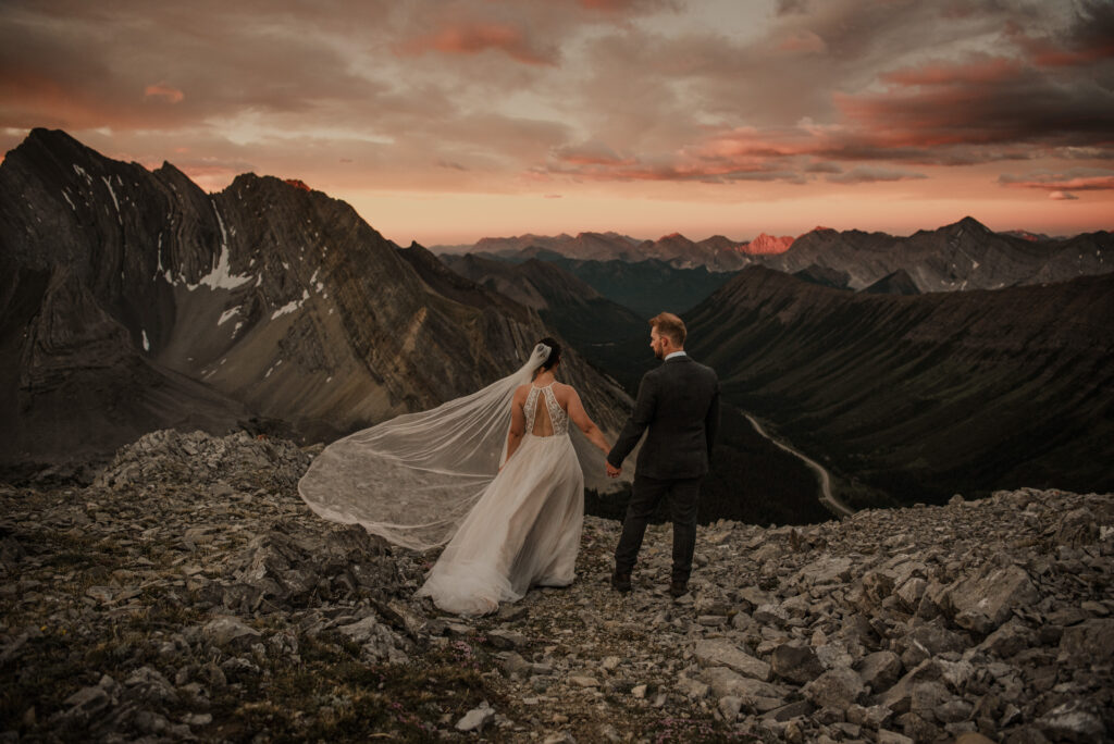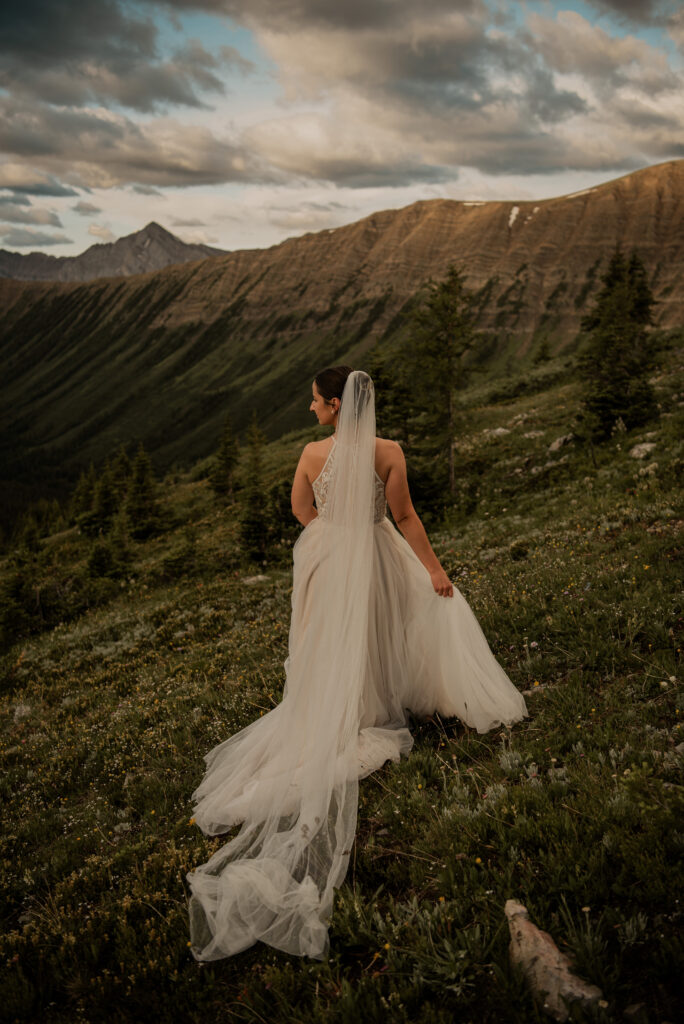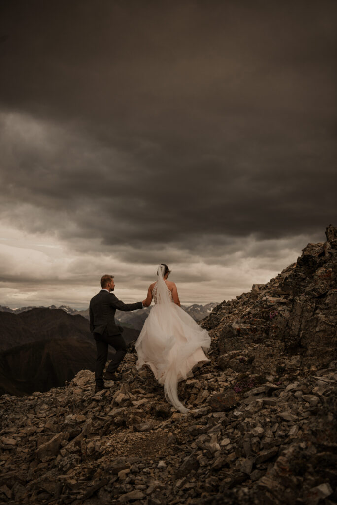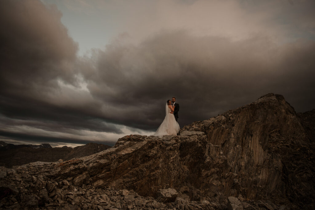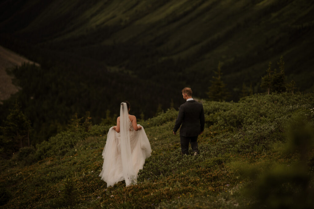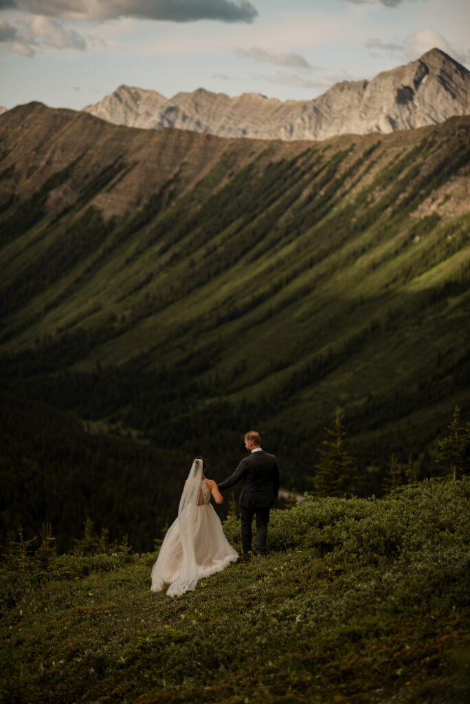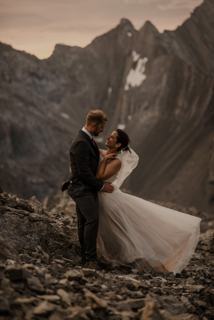 This is a great example of a perfect timeline for a hiking elopement if you want to also include guests. Do the sunrise hike and private vows first, then meet family later for a little ceremony on the ground. Have a look at these epic photos from this hiking elopement in Kananaskis!