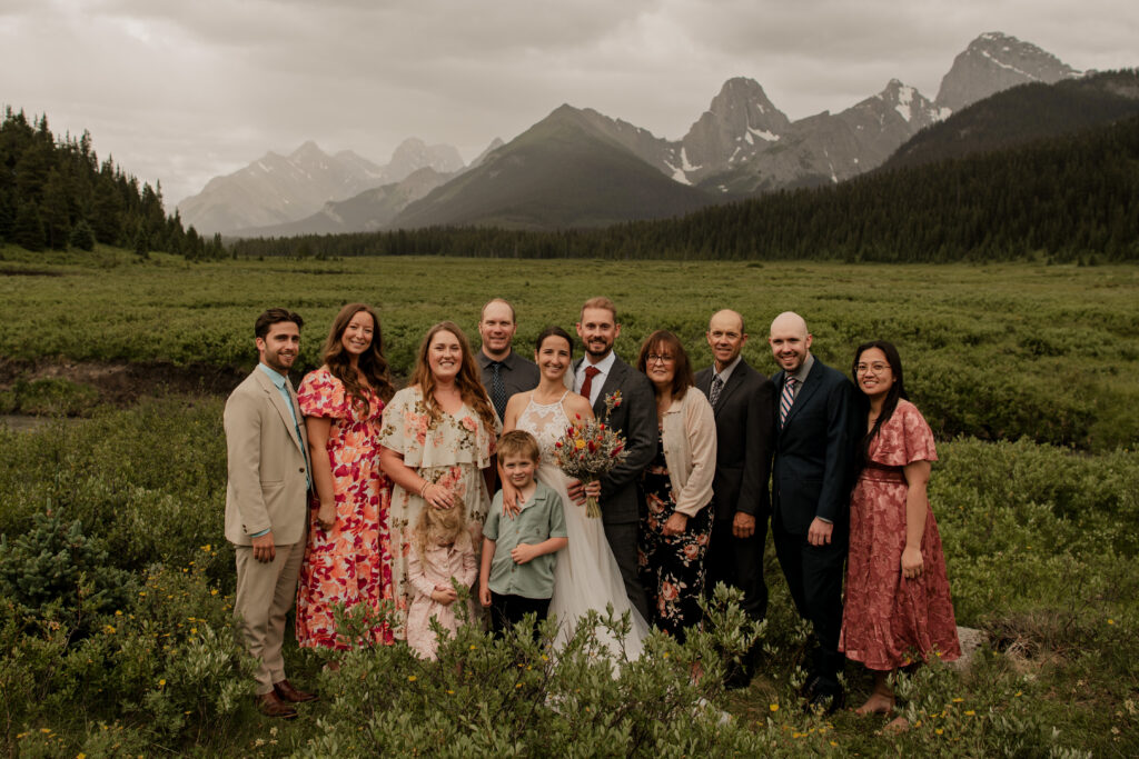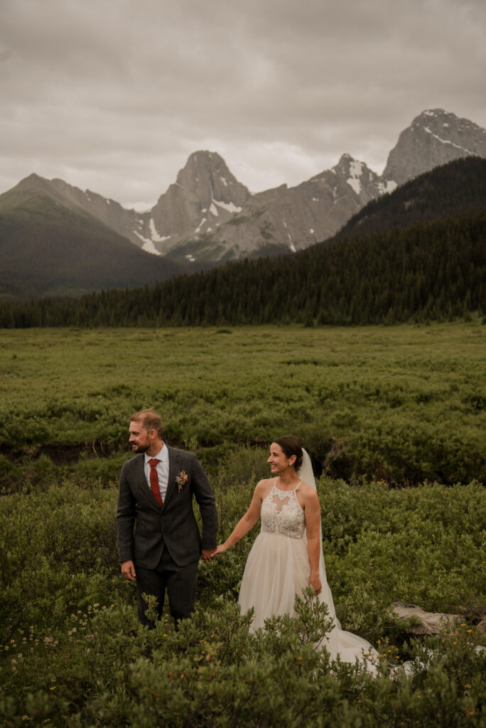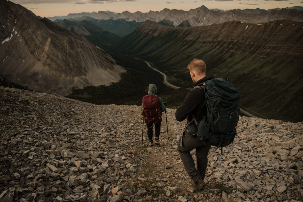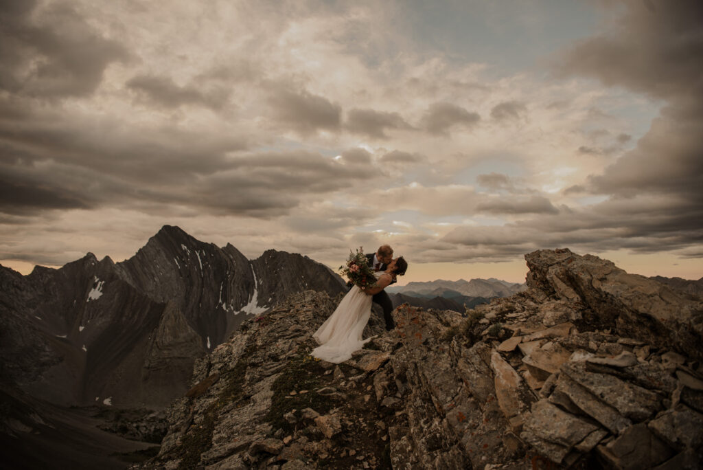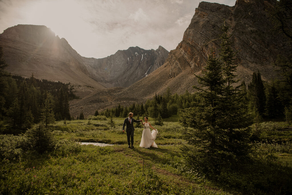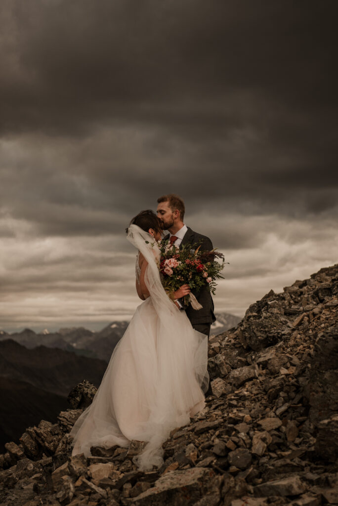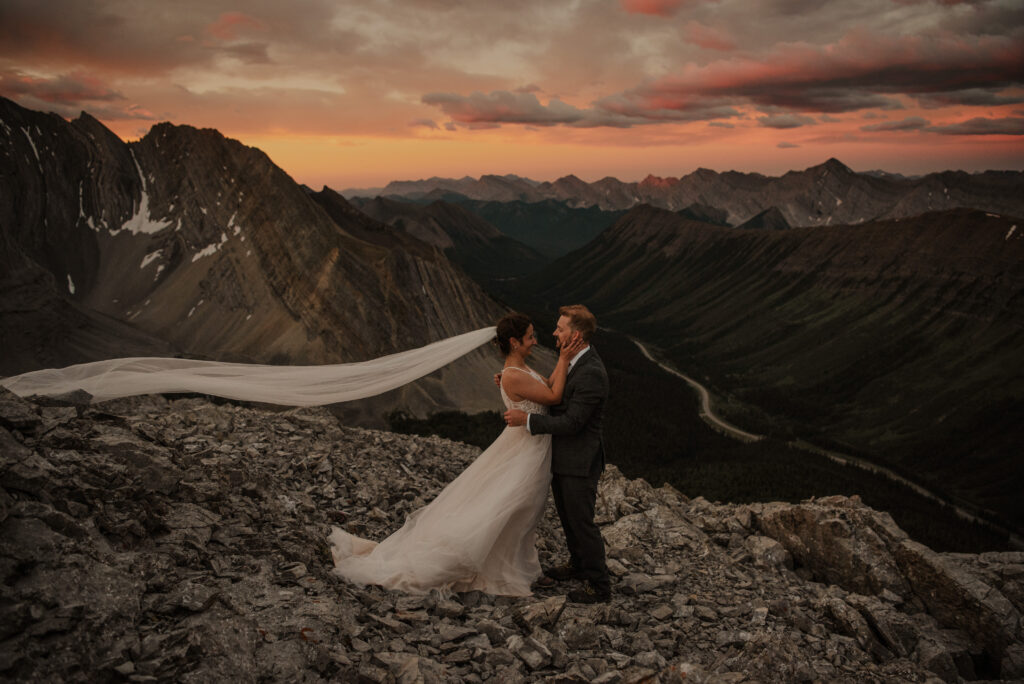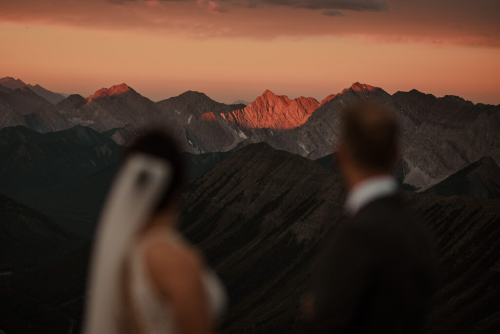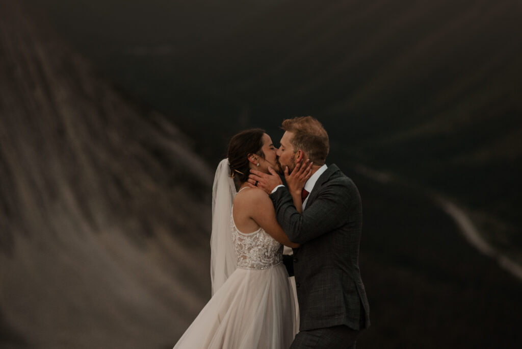 This is a great example of a perfect timeline for a hiking elopement if you want to also include guests. Do the sunrise hike and private vows first, then meet family later for a little ceremony on the ground. Have a look at these epic photos from this hiking elopement in Kananaskis!