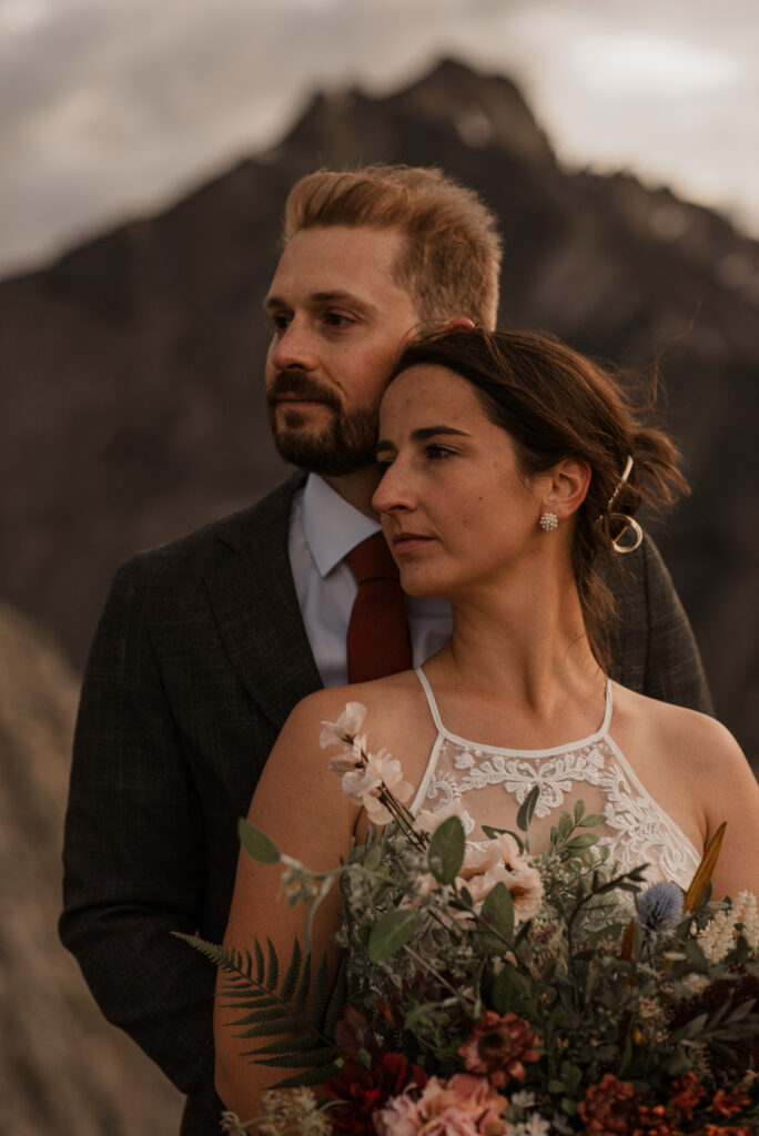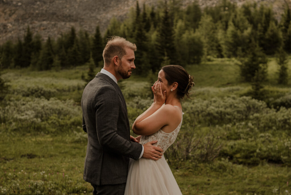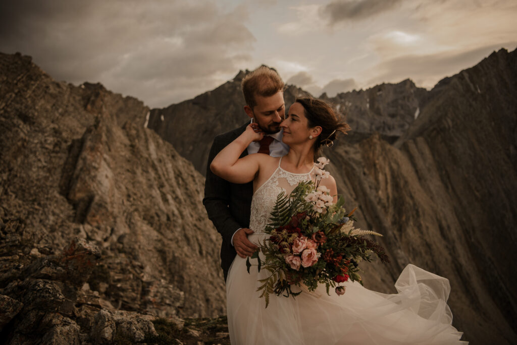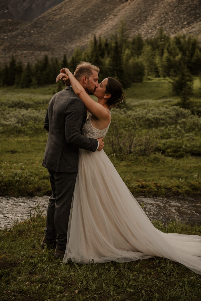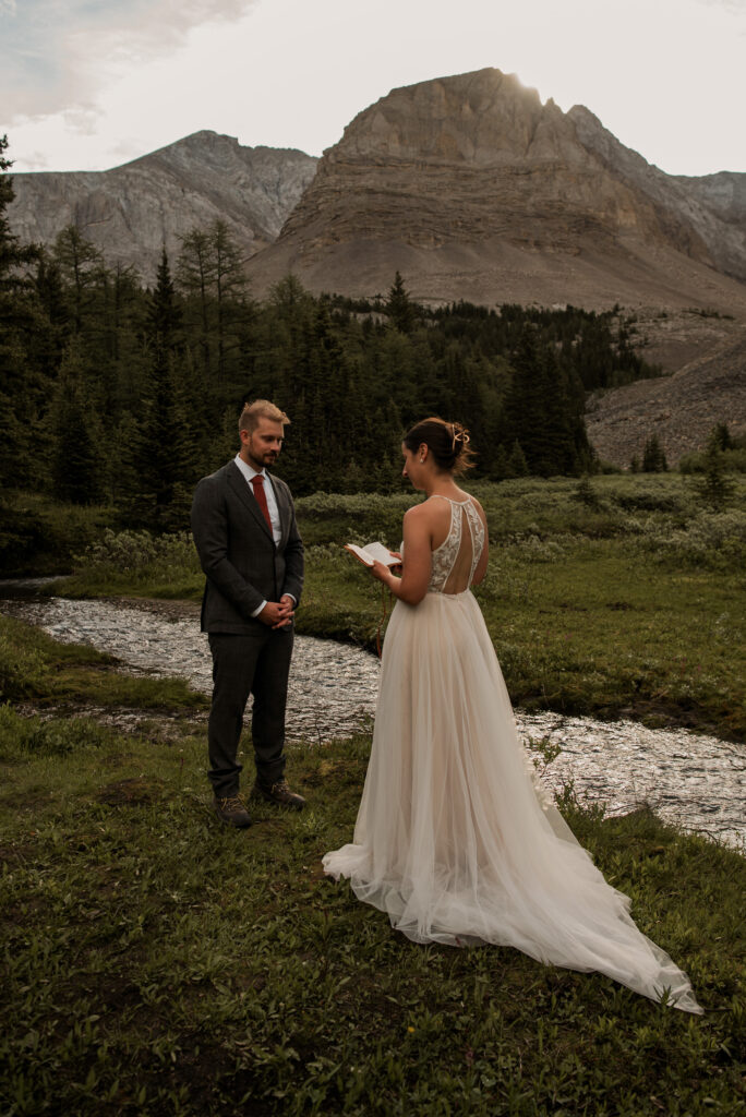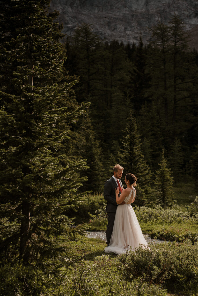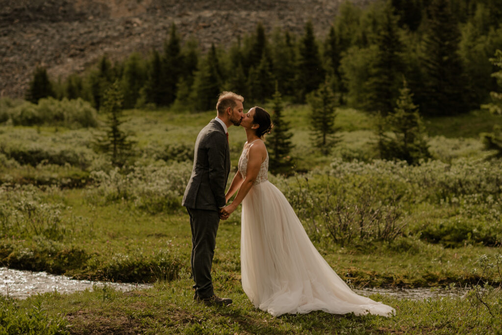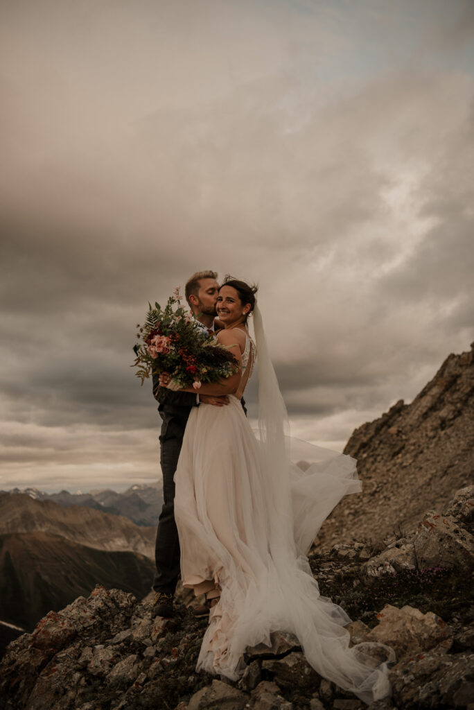 This is a great example of a perfect timeline for a hiking elopement if you want to also include guests. Do the sunrise hike and private vows first, then meet family later for a little ceremony on the ground. Have a look at these epic photos from this hiking elopement in Kananaskis!