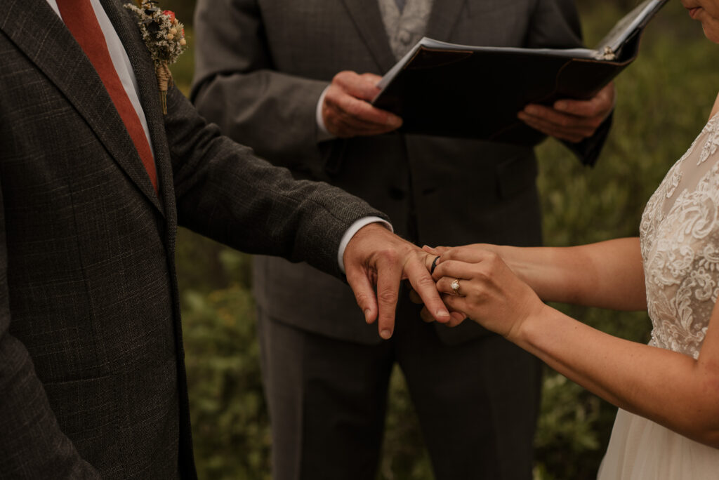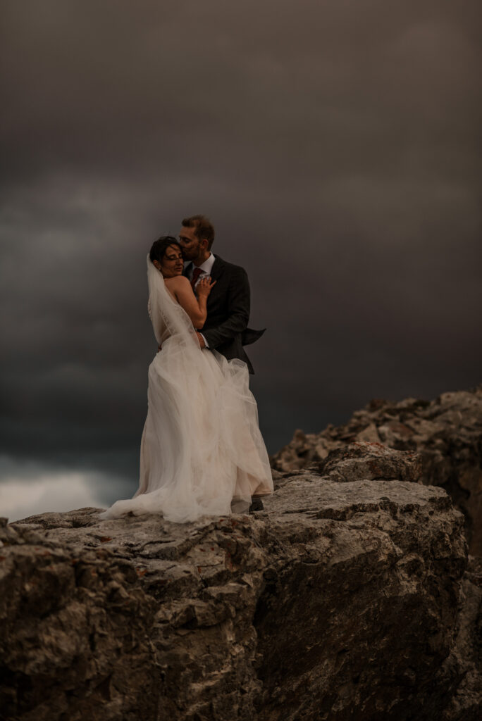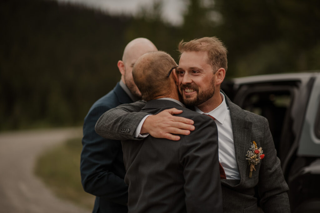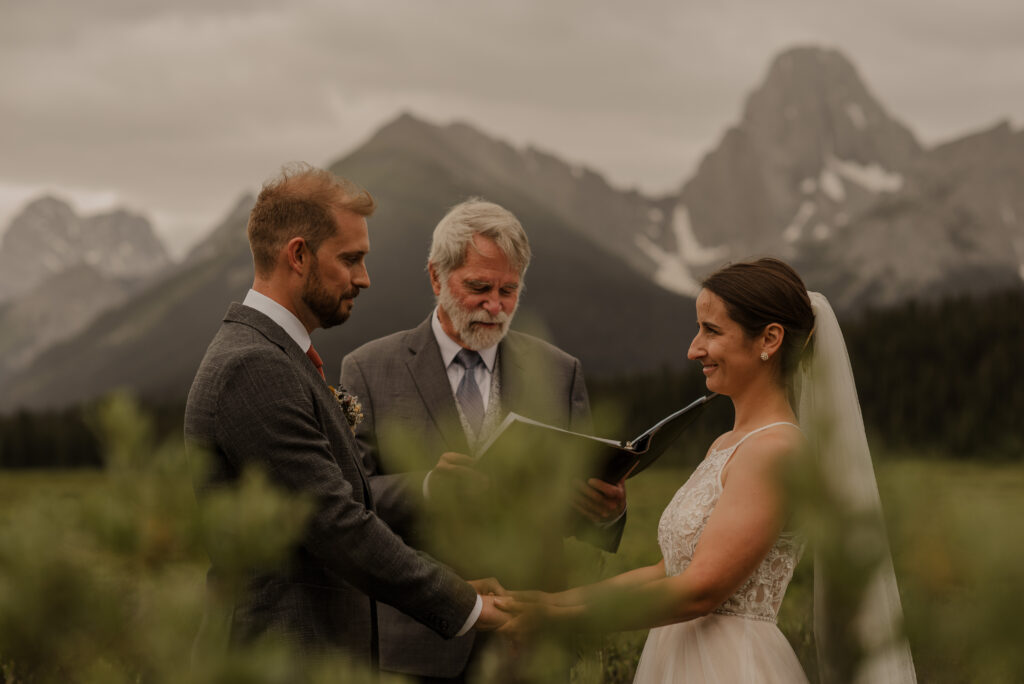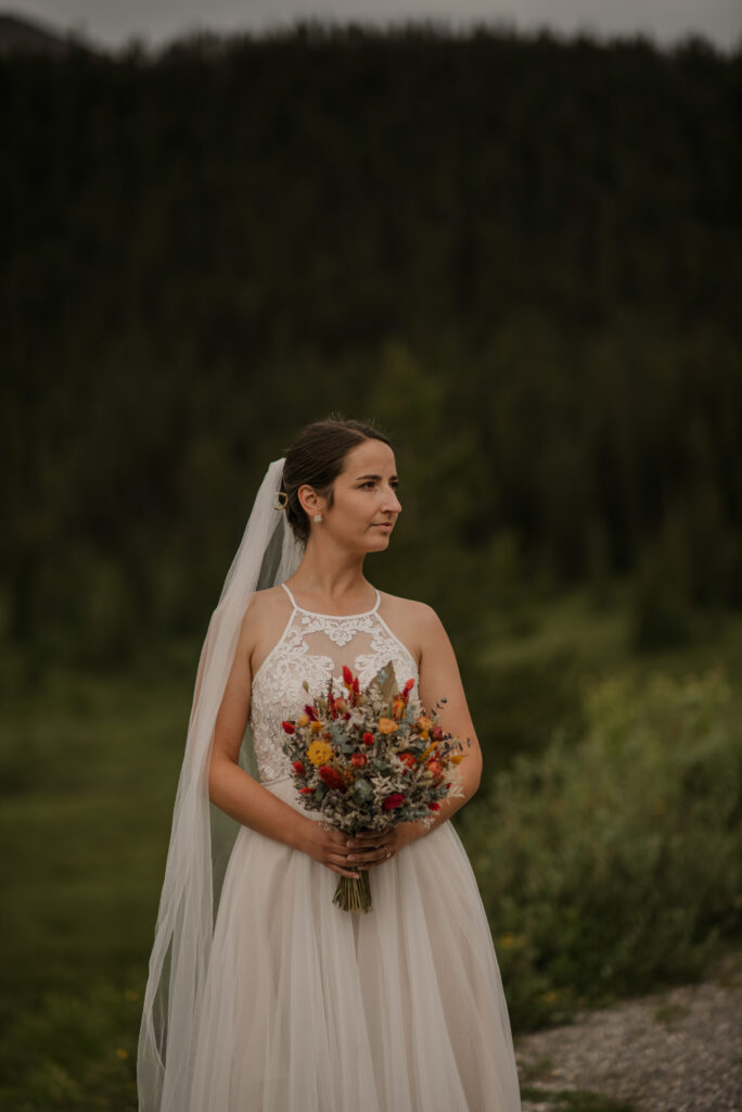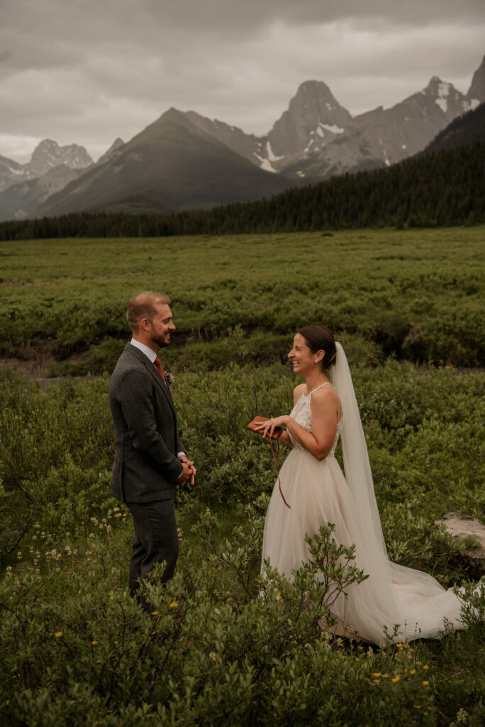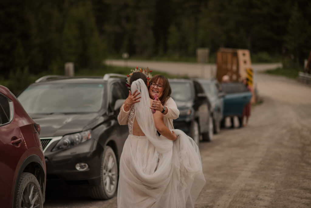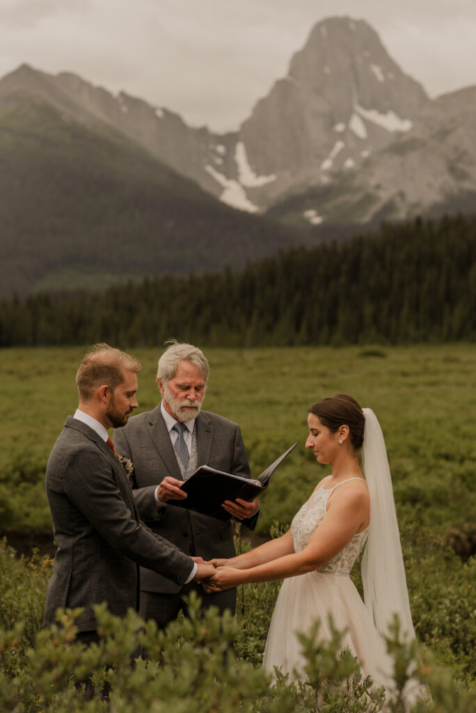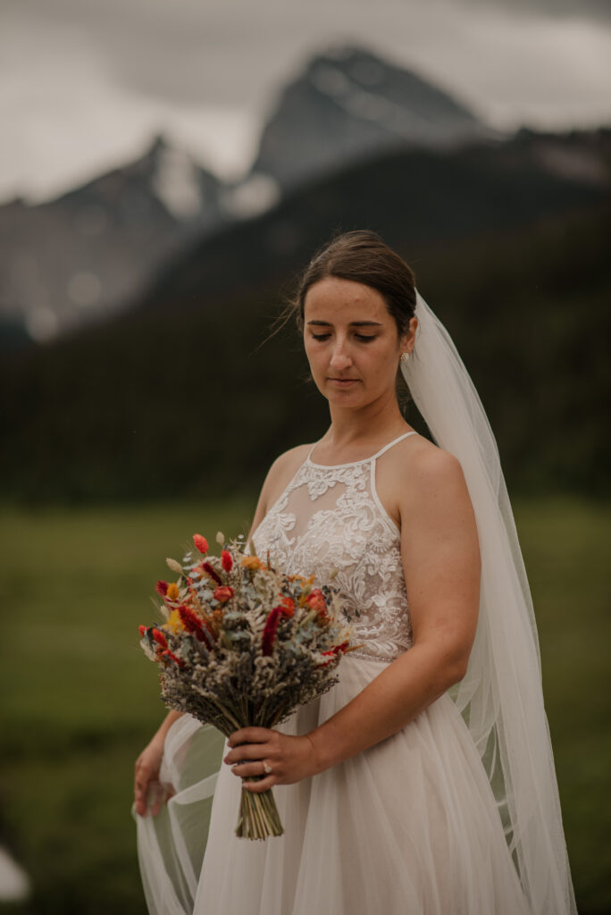 This is a great example of a perfect timeline for a hiking elopement if you want to also include guests. Do the sunrise hike and private vows first, then meet family later for a little ceremony on the ground. Have a look at these epic photos from this hiking elopement in Kananaskis!