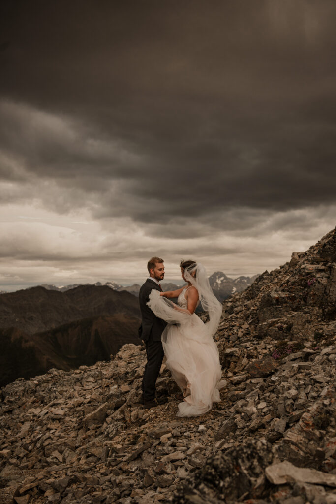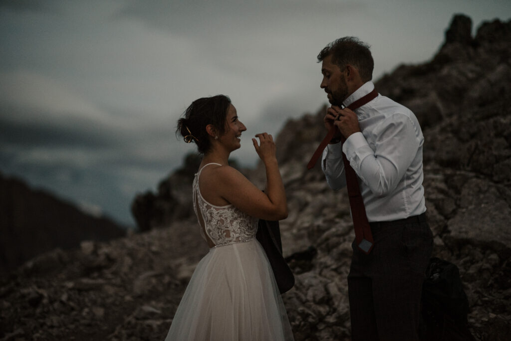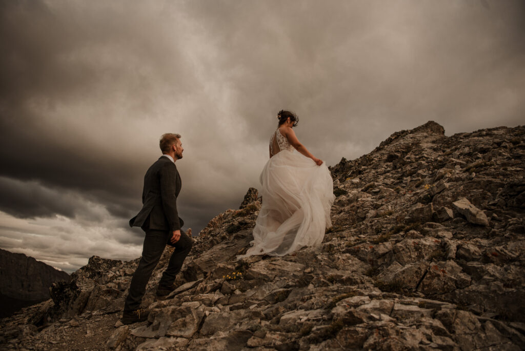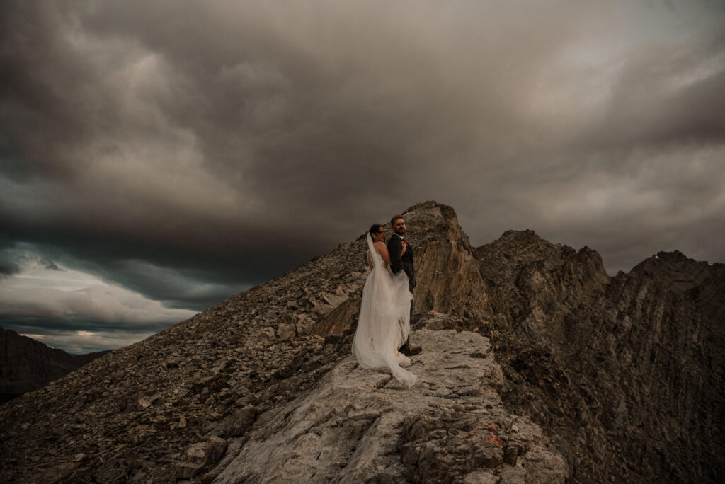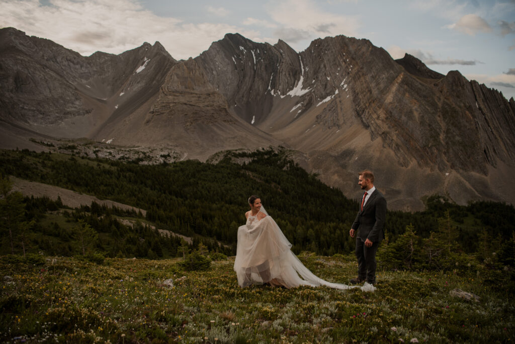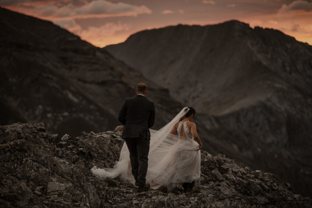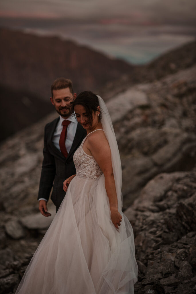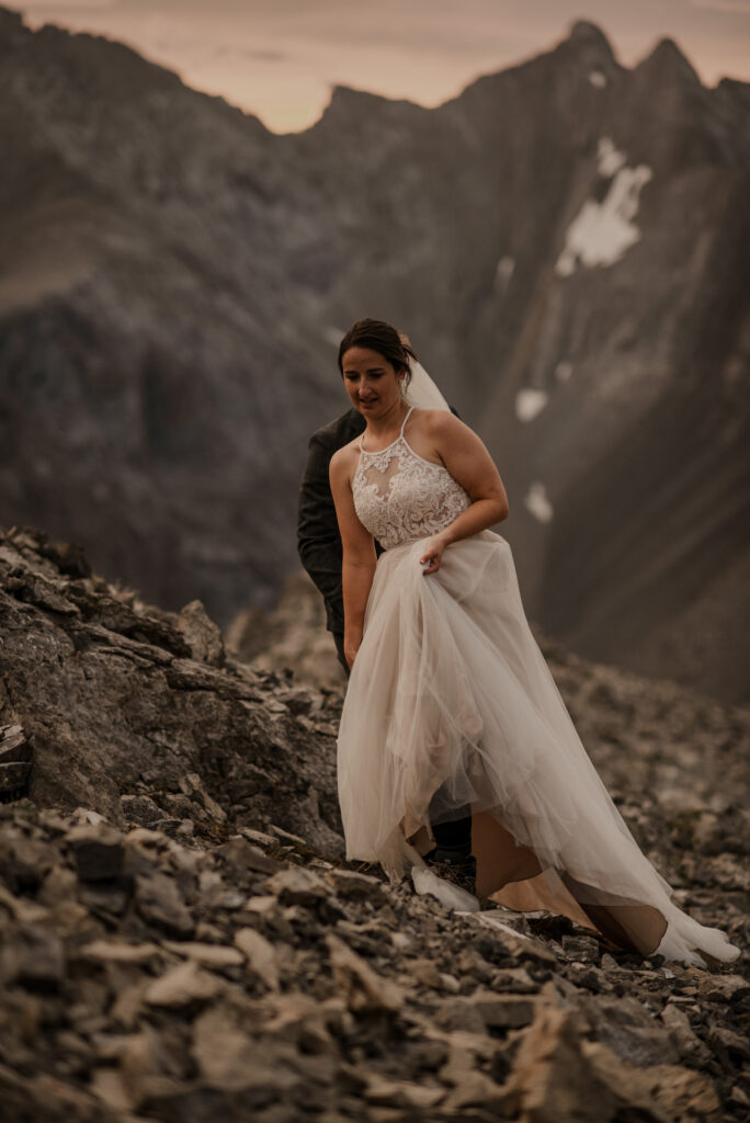 I met Les and Chloe in the wee hours of the morning deep in Kananaskis to start the hike up to the summit in the dark. It was a windy, cool morning. The best thing about hiking up in the dark is that you can’t see the destination, so you have to just keep putting one foot in front of the other. When we reached the summit of Little Arethusa, they changed into their wedding attire. One tip you could learn from Chloe, is to have a dress that’s super easy to get on so you don’t have to freeze while you’re getting changed!