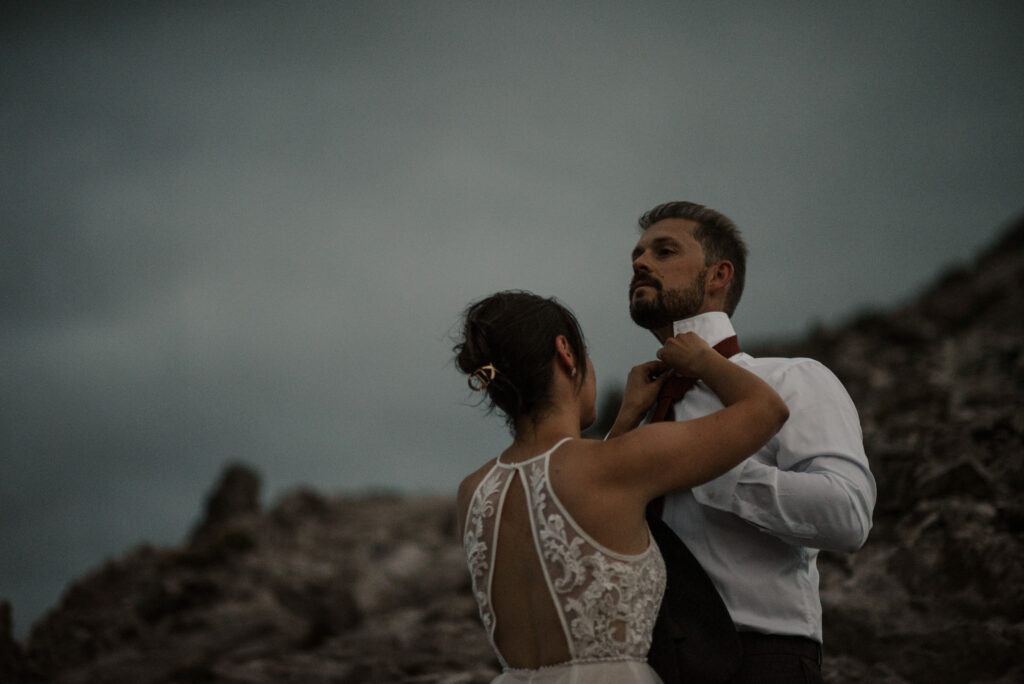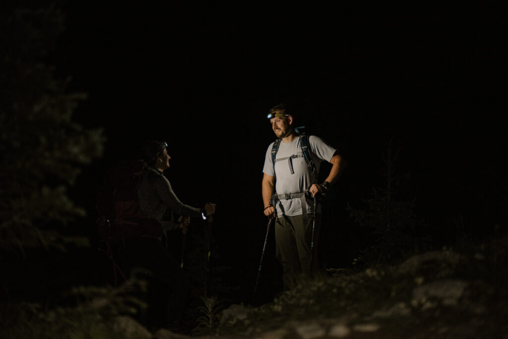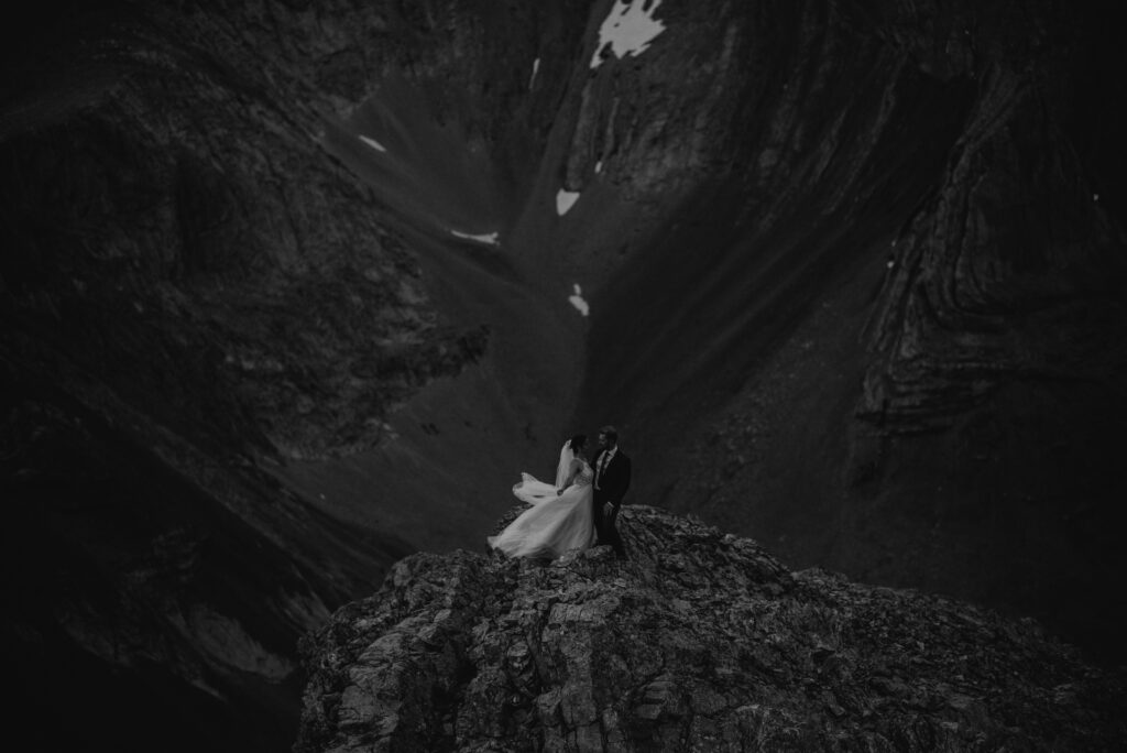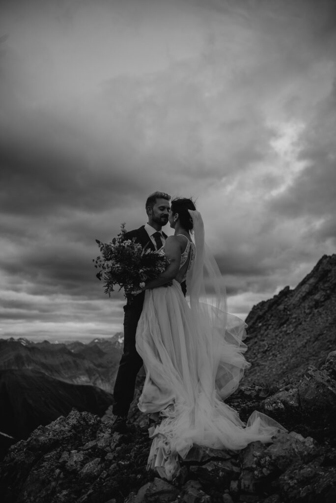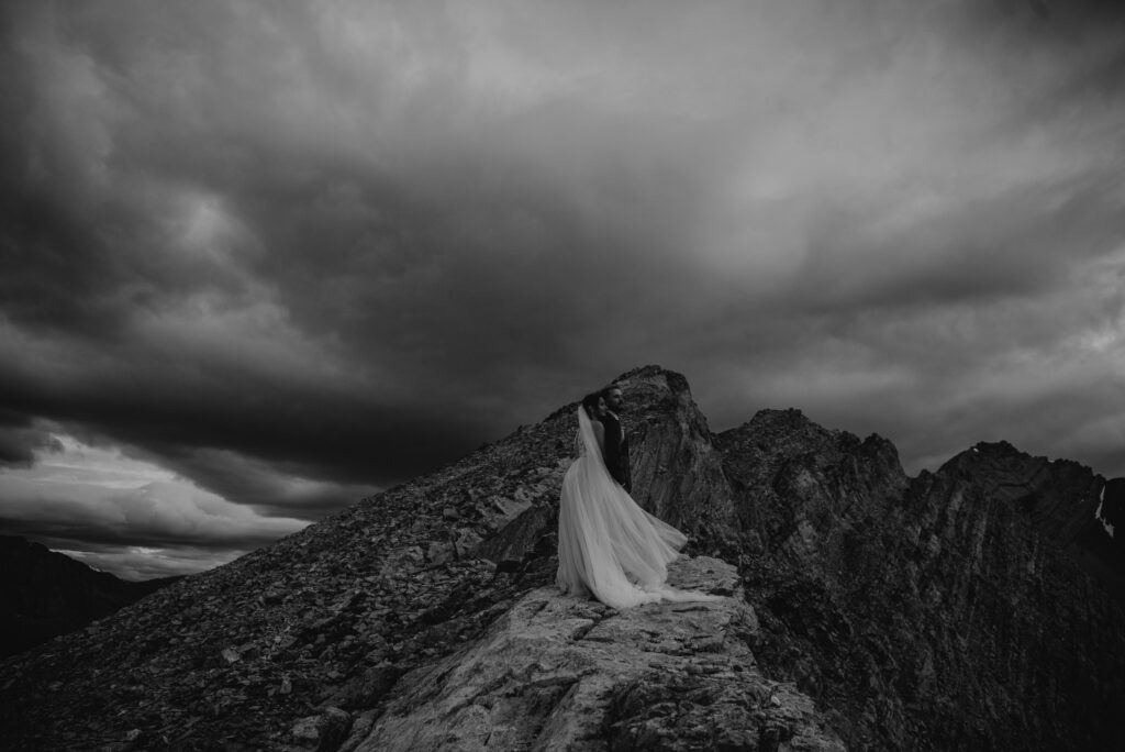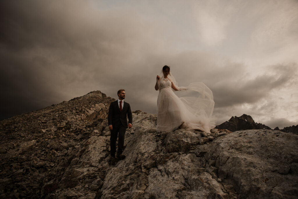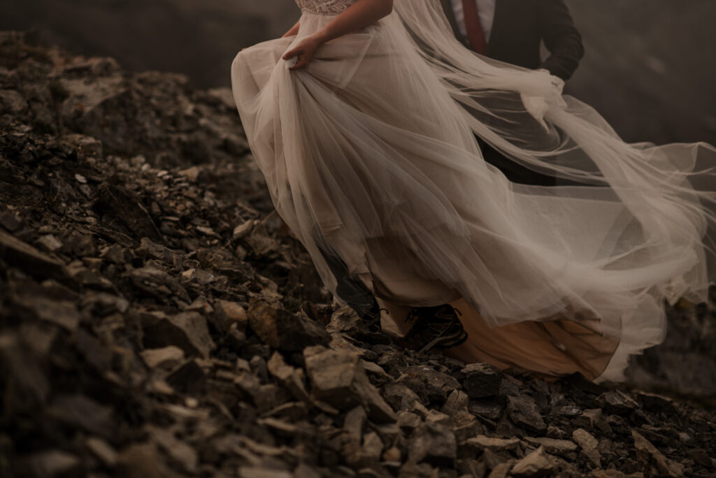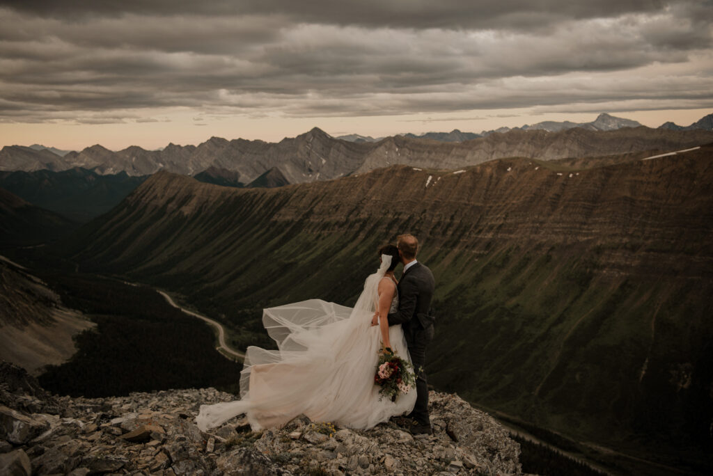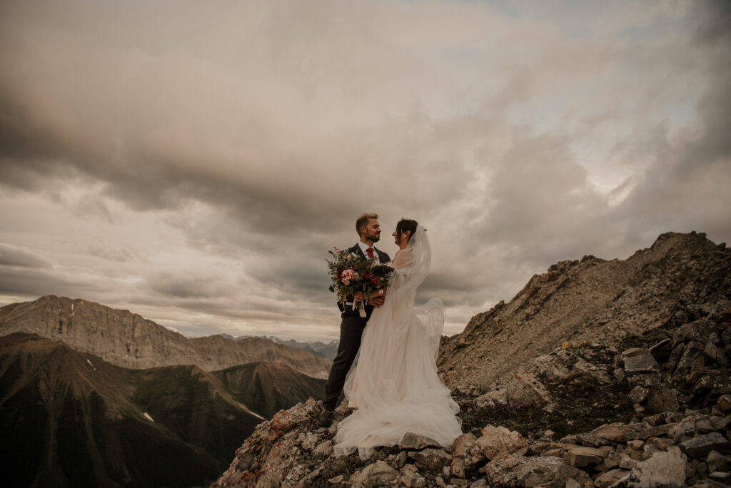 I met Les and Chloe in the wee hours of the morning deep in Kananaskis to start the hike up to the summit in the dark. It was a windy, cool morning. The best thing about hiking up in the dark is that you can’t see the destination, so you have to just keep putting one foot in front of the other. When we reached the summit of Little Arethusa, they changed into their wedding attire. One tip you could learn from Chloe, is to have a dress that’s super easy to get on so you don’t have to freeze while you’re getting changed!