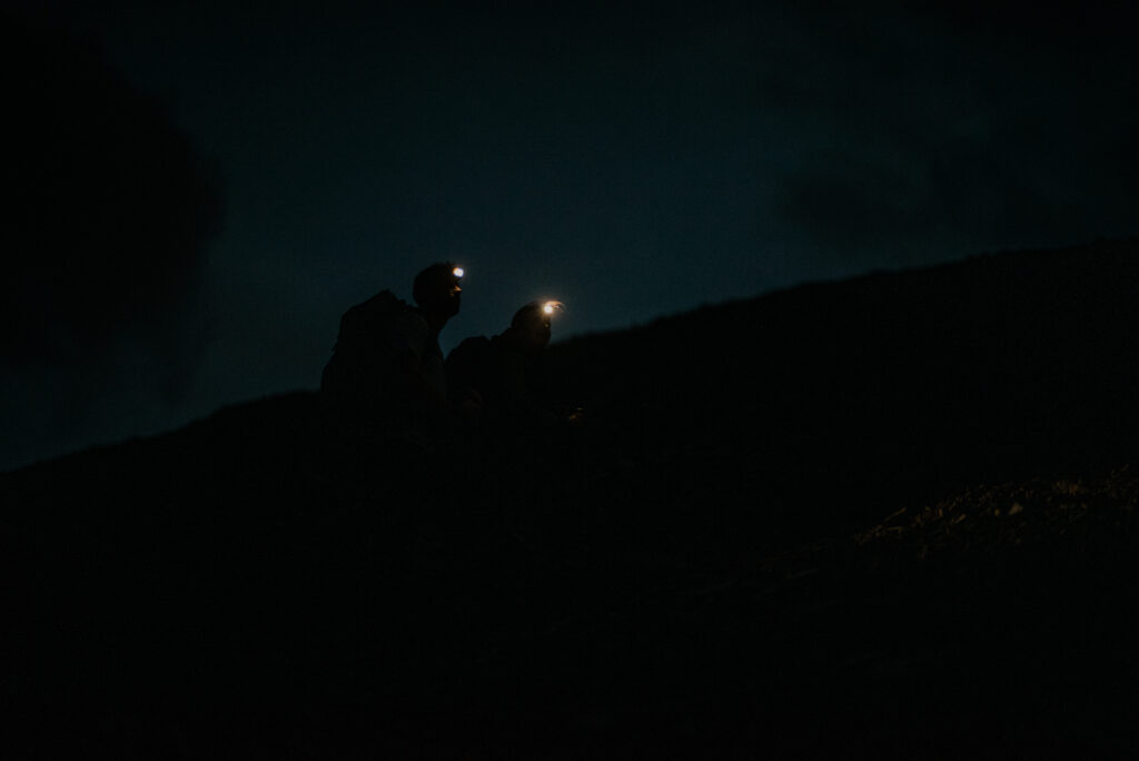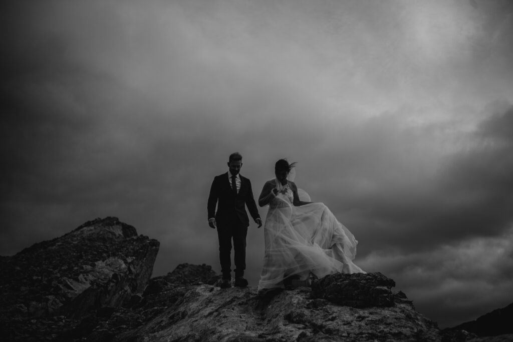 Les and Chloe chose to do personal vows for their elopement, but we waited until later when we were back down in the meadow area. But as the sun started to rise, we took photos at the summit with the beautiful colours in the sky and the surrounding mountains. The dark sky was laced with threads of pink clouds as her dress blew in the wind, creating some of the most moody, amazing elopement photos I’ve ever taken ! Little Arethusa is a new favorite for sunrise hiking elopements for sure!