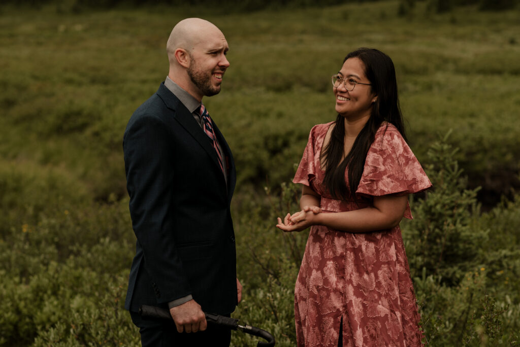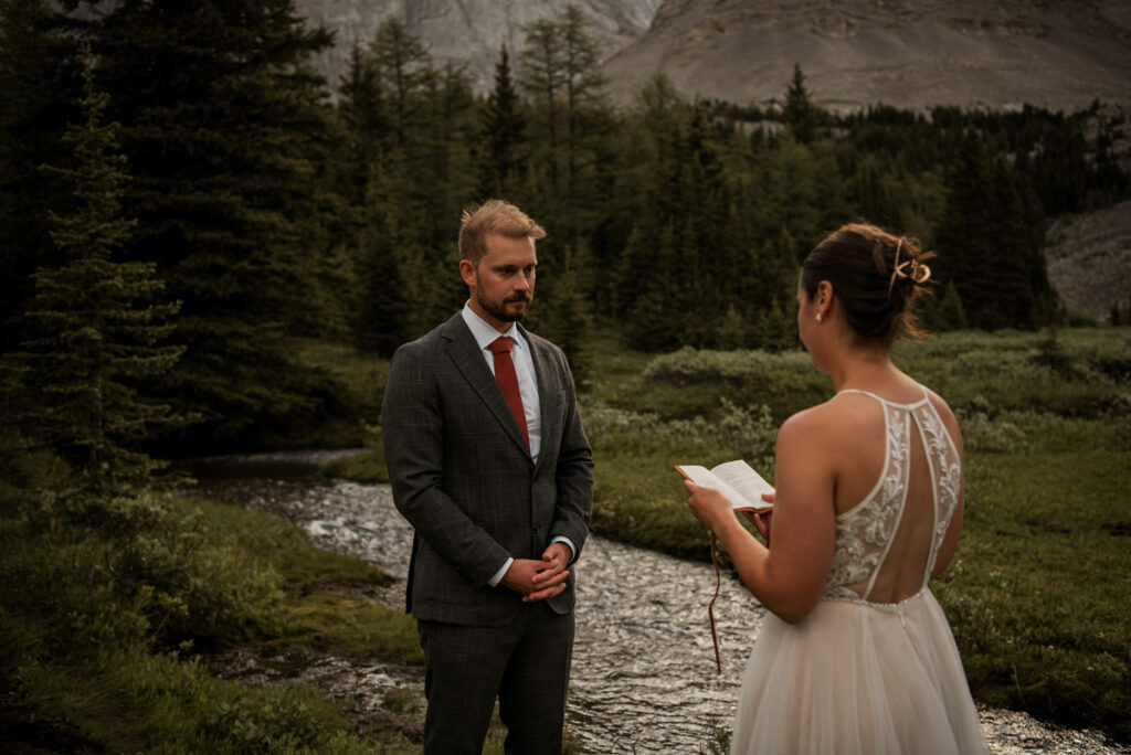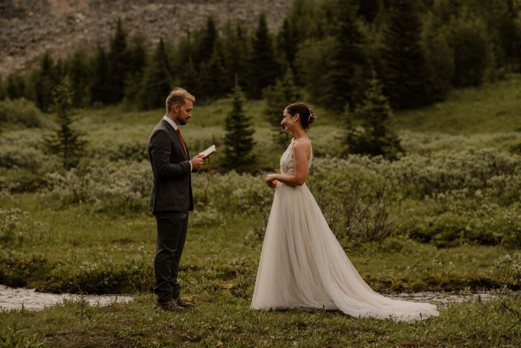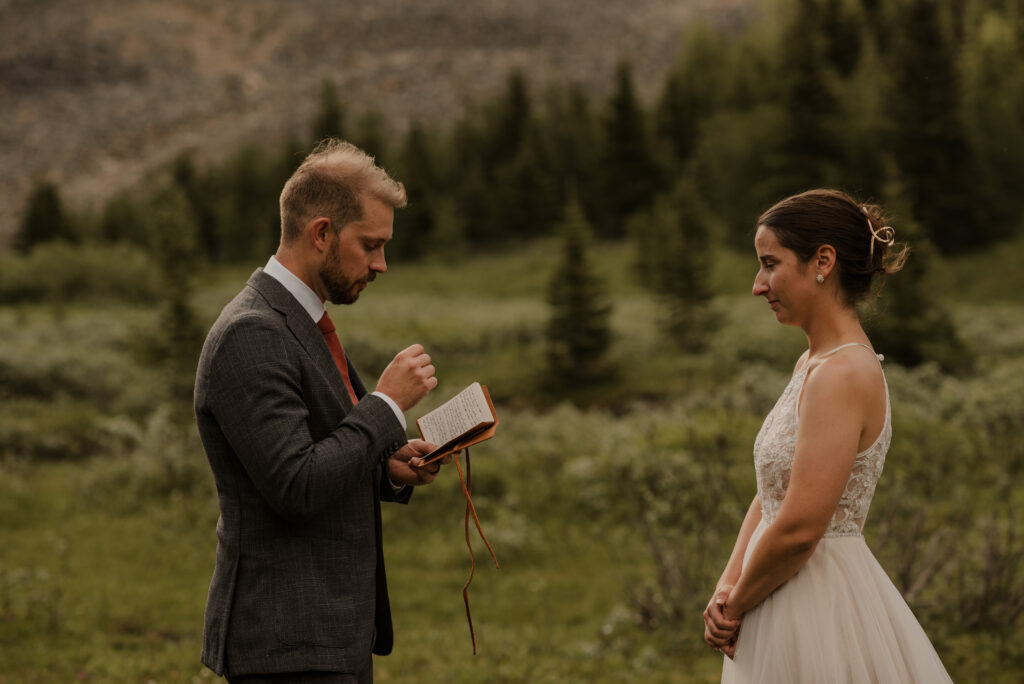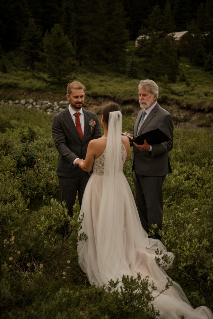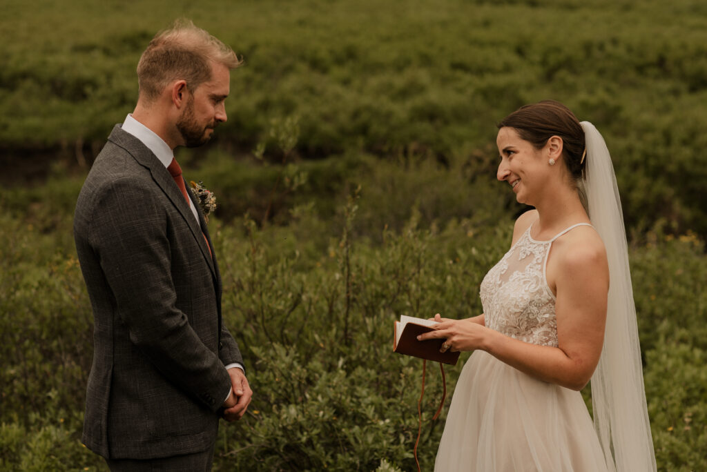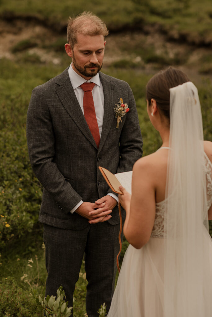 After we finished at the summit, we headed down to the meadow for some more photos. The wildflowers were in full bloom, all different colours scattered around the area. The mountains surrounded us. The sun was out and warmed us up, casting a golden glow across the quiet landscape. We hiked a little further down where Les and Chloe read their personal vows to each other. It was such an intimate, personal experience it almost made me cry too.