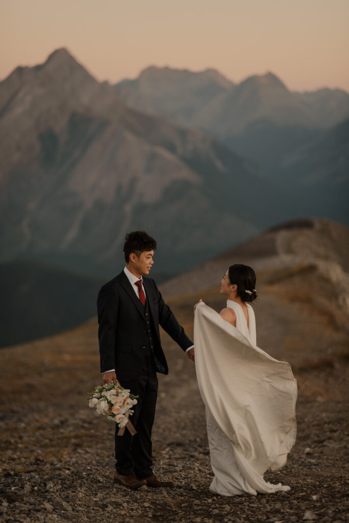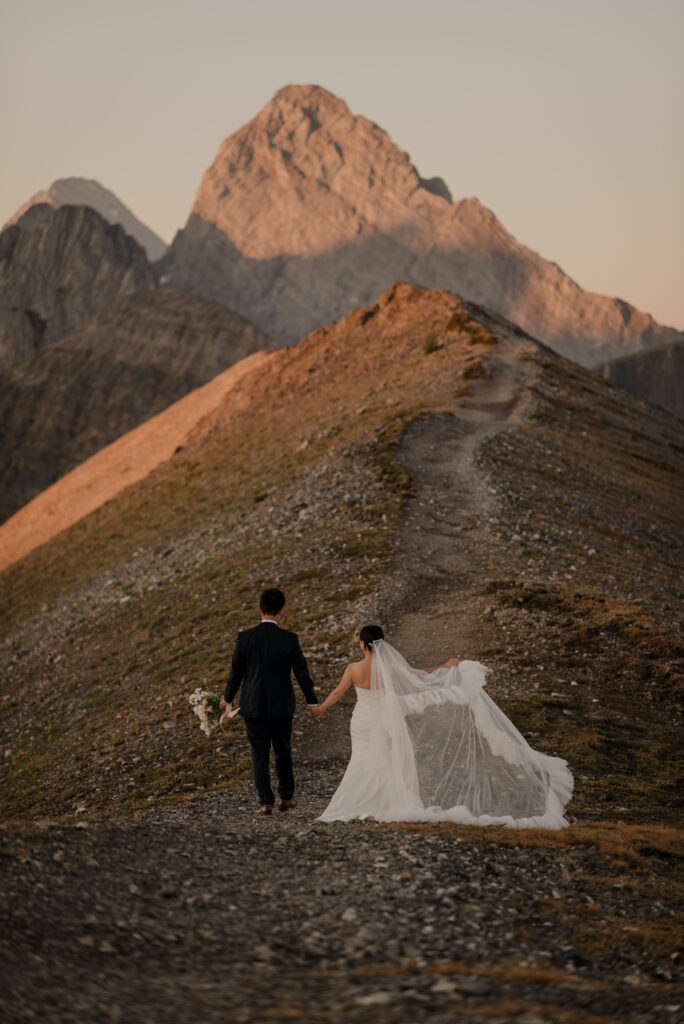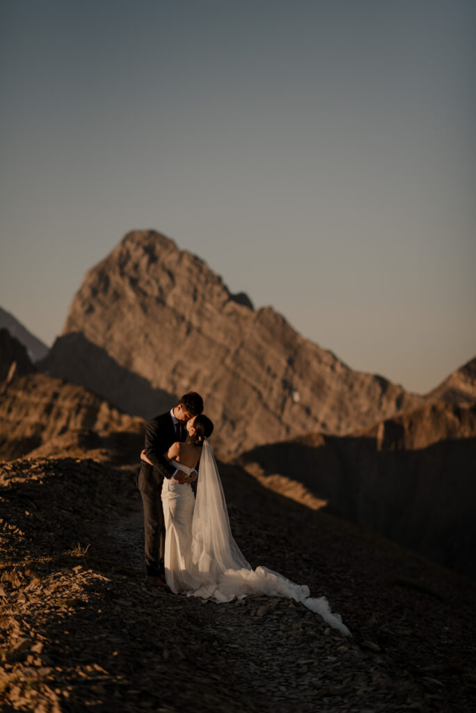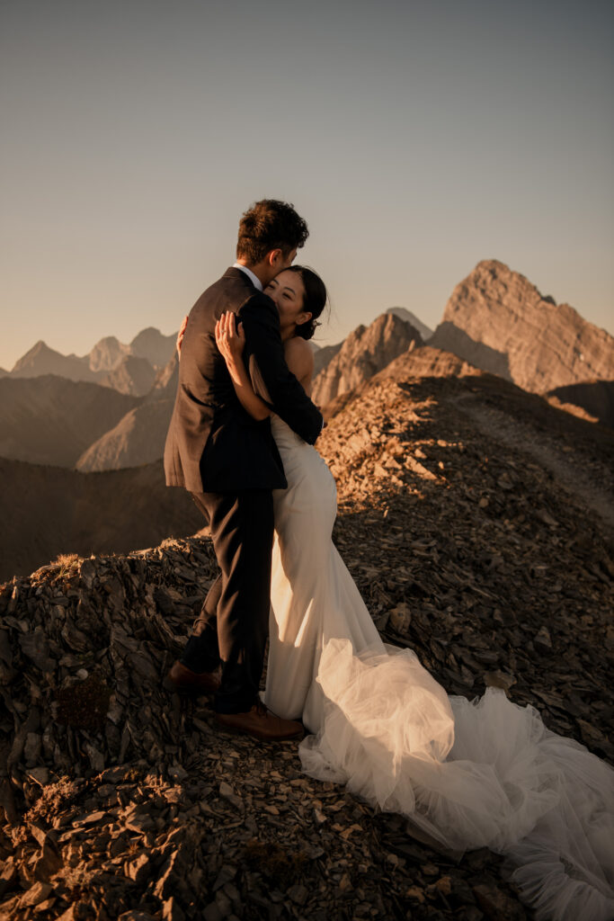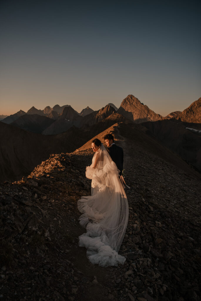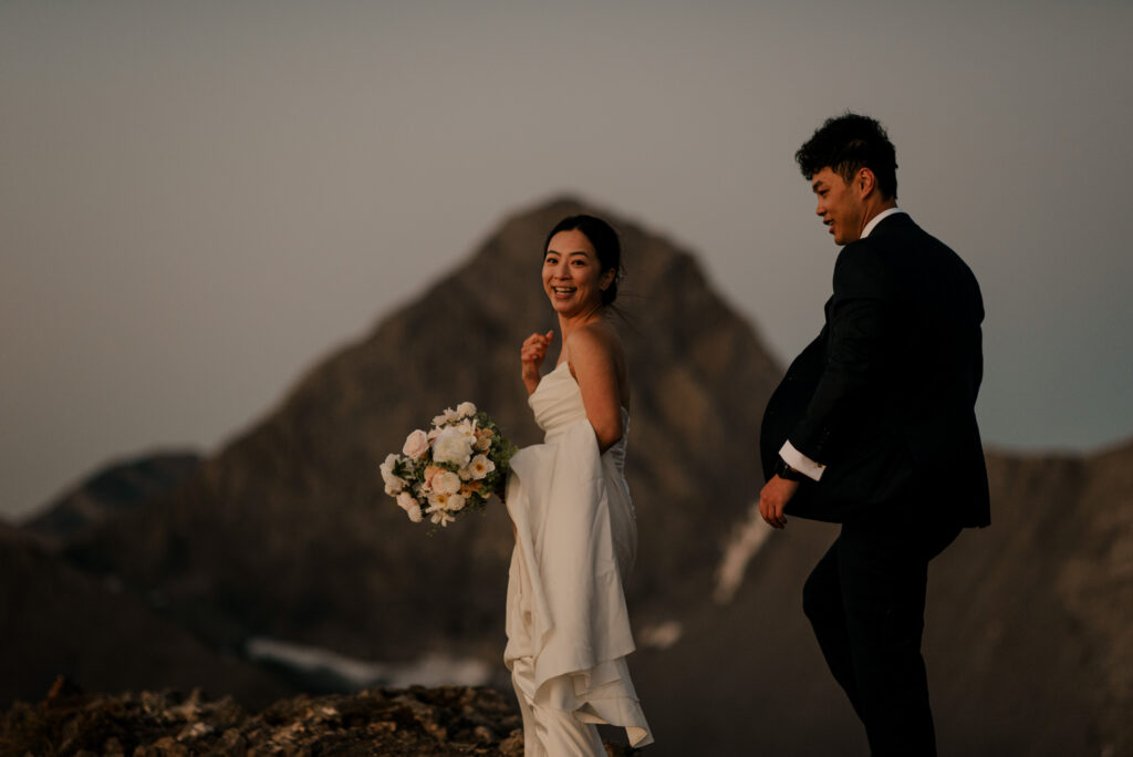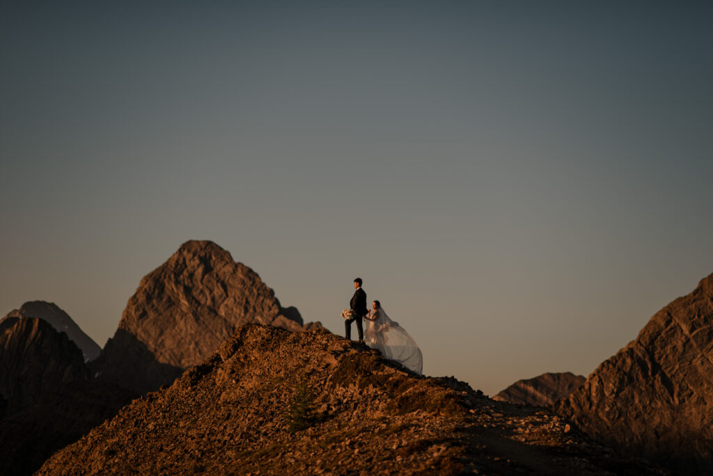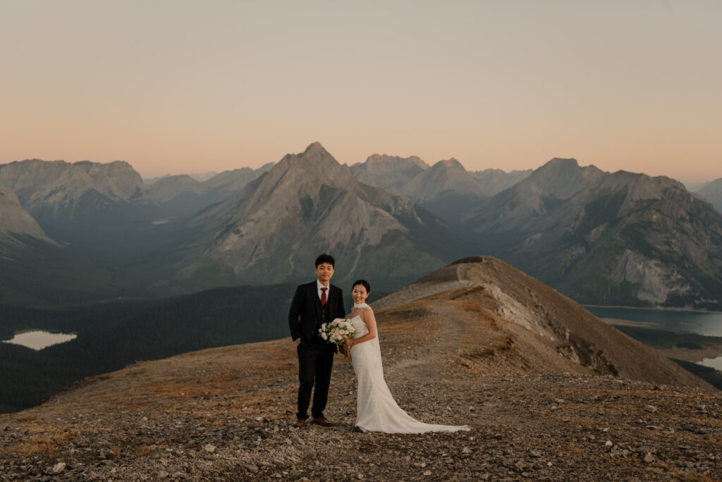 If you want to have a traditional wedding or lots of guests at a venue, that doesn’t mean you have to forfeit your epic mountain top wedding photos! This couple was having their actual wedding in China, but wanting photos on a mountain as well. So they chose to do sunrise hiking pre-wedding photos in Kananaskis! We actually ended up rescheduling this session due to miserable weather, but the morning that we did do the hike was insanely beautiful!