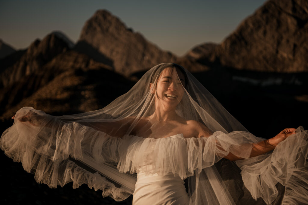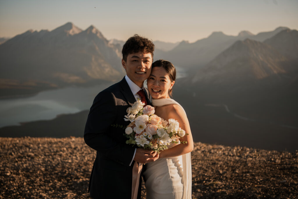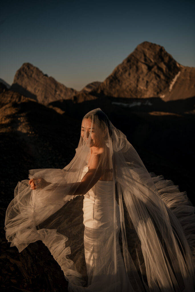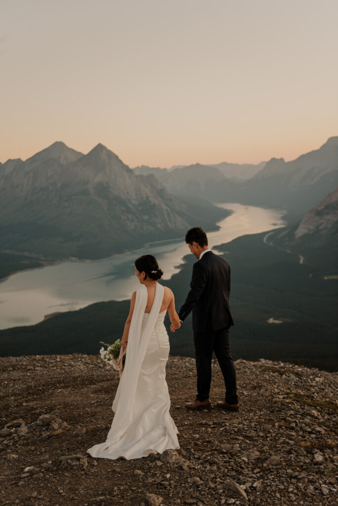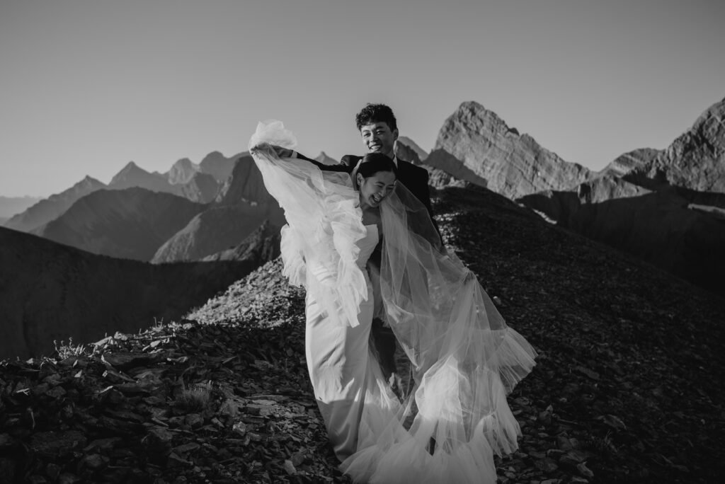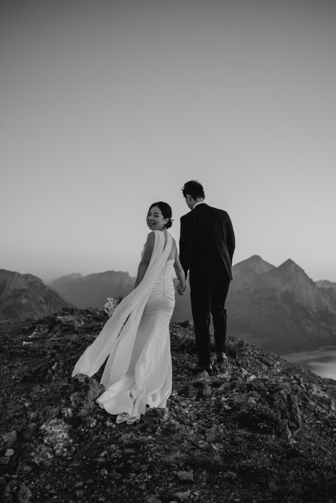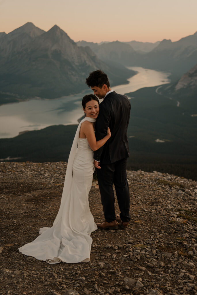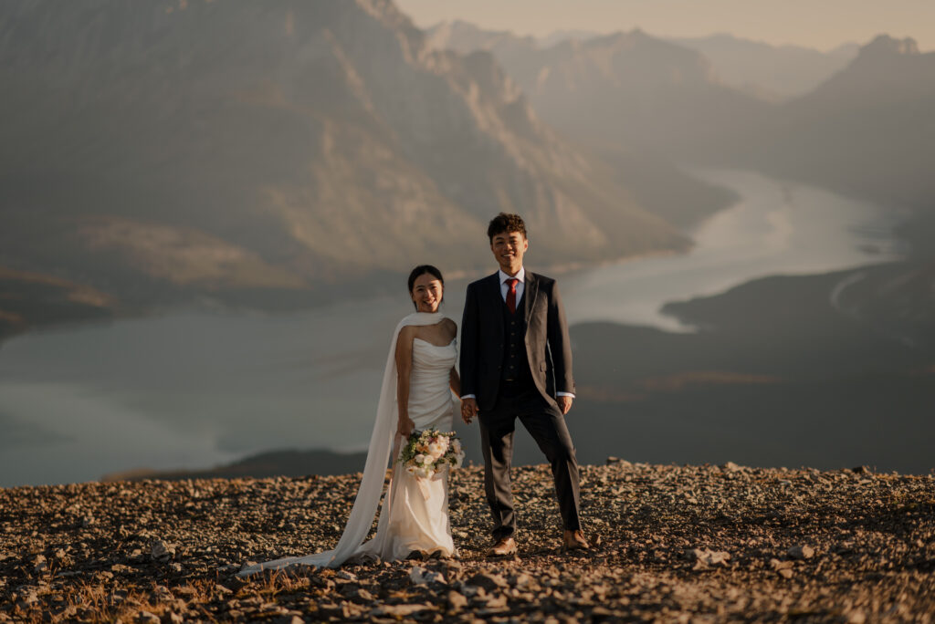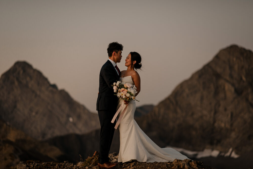 If you want to have a traditional wedding or lots of guests at a venue, that doesn’t mean you have to forfeit your epic mountain top wedding photos! This couple was having their actual wedding in China, but wanting photos on a mountain as well. So they chose to do sunrise hiking pre-wedding photos in Kananaskis! We actually ended up rescheduling this session due to miserable weather, but the morning that we did do the hike was insanely beautiful!
