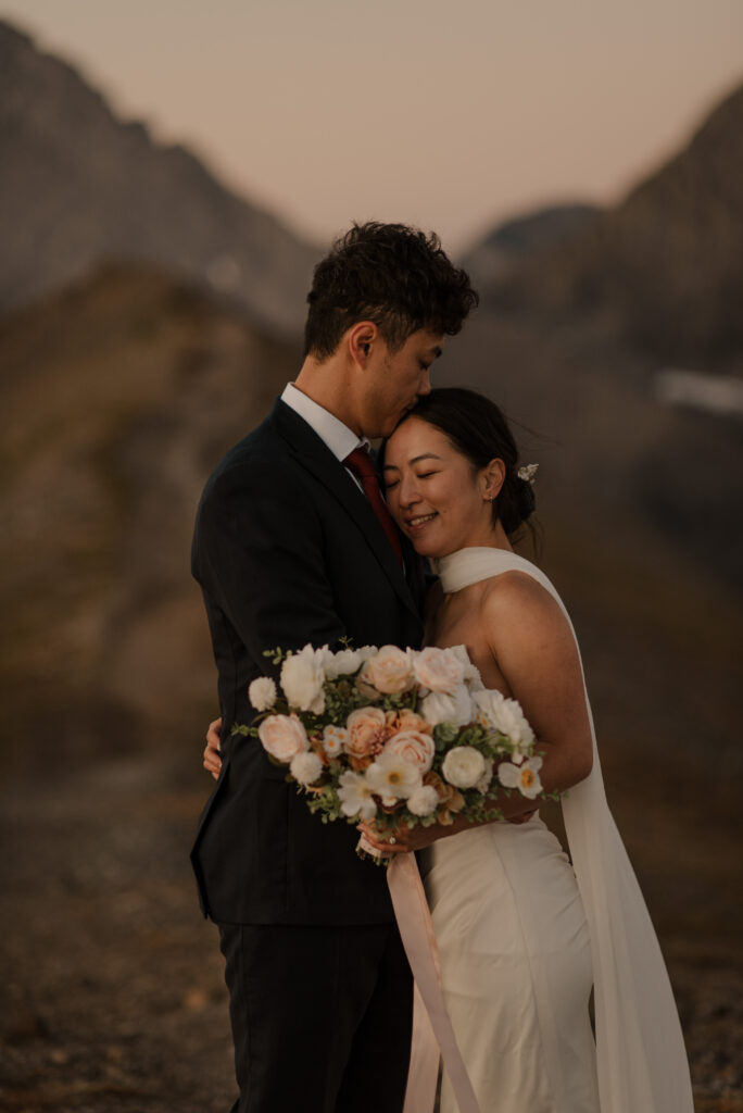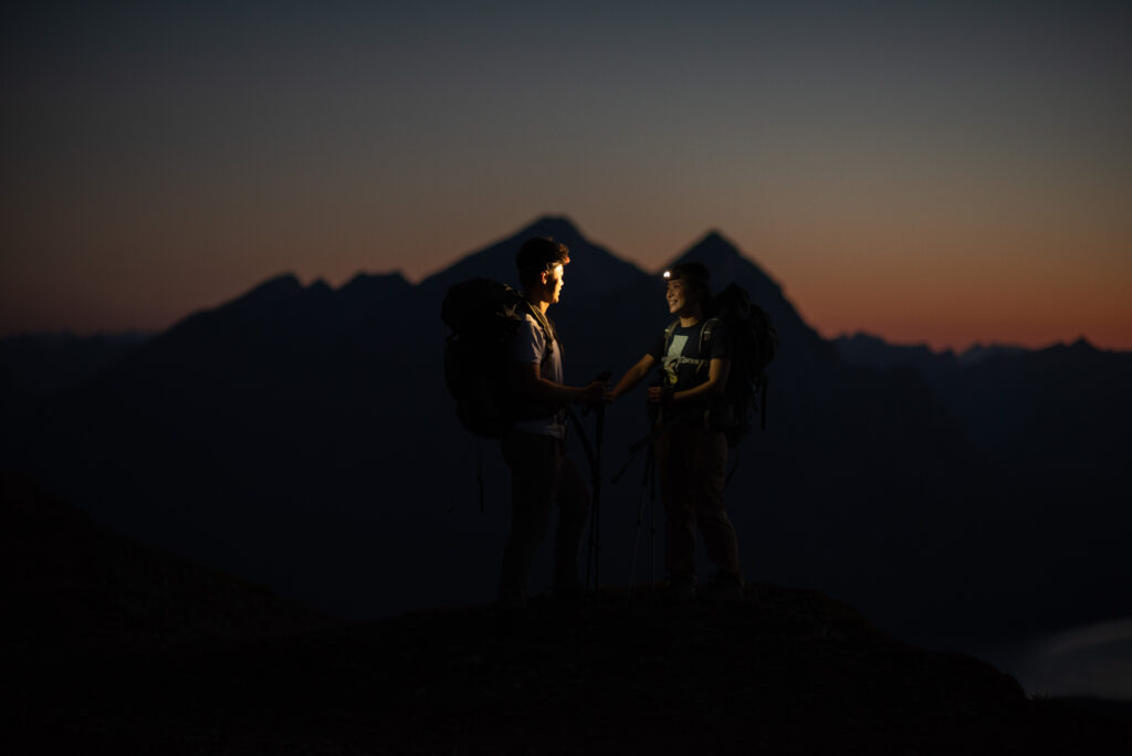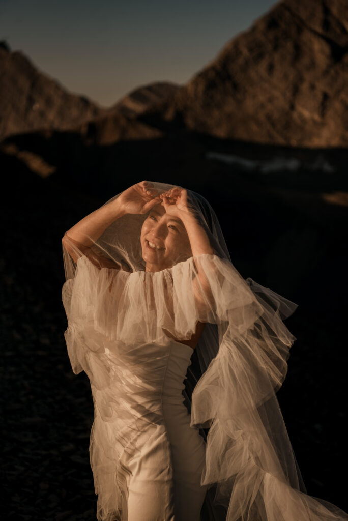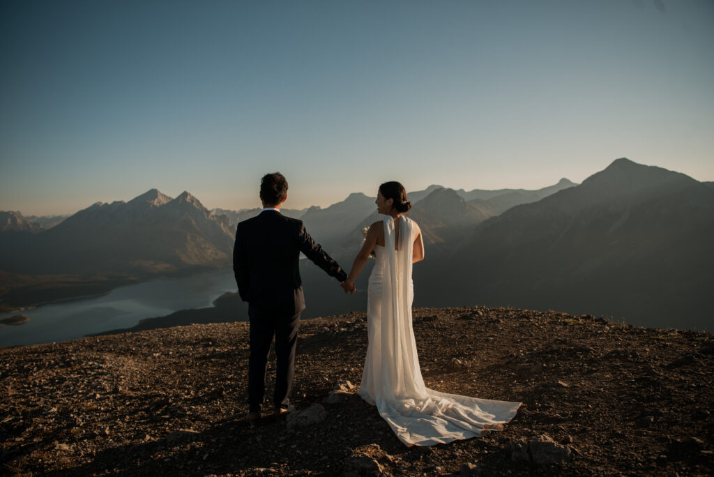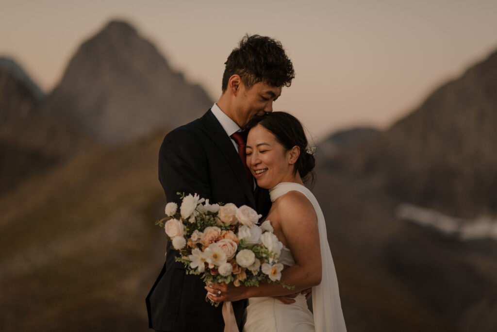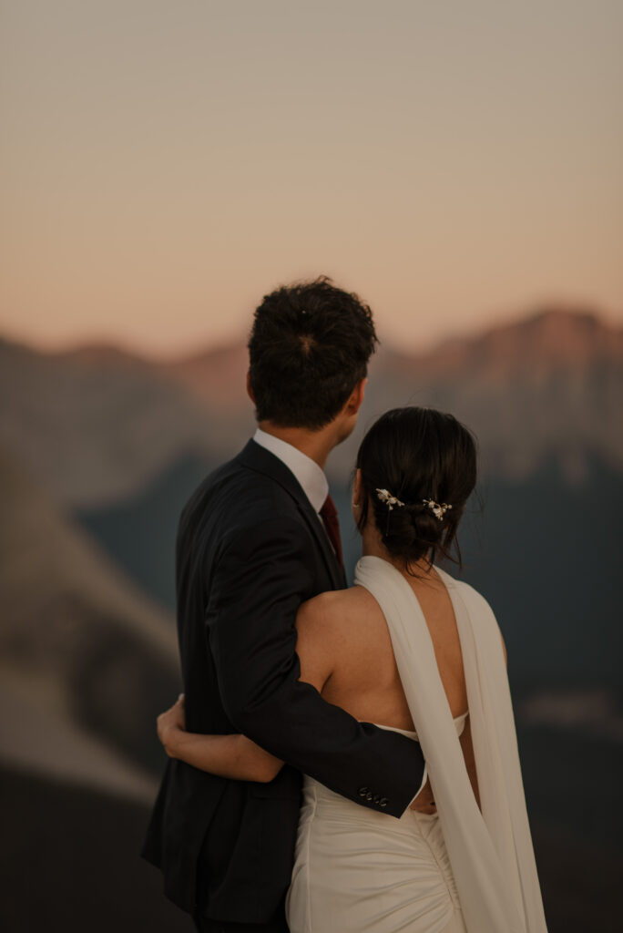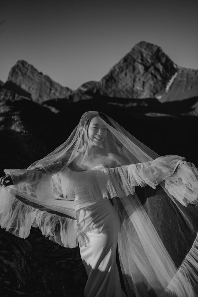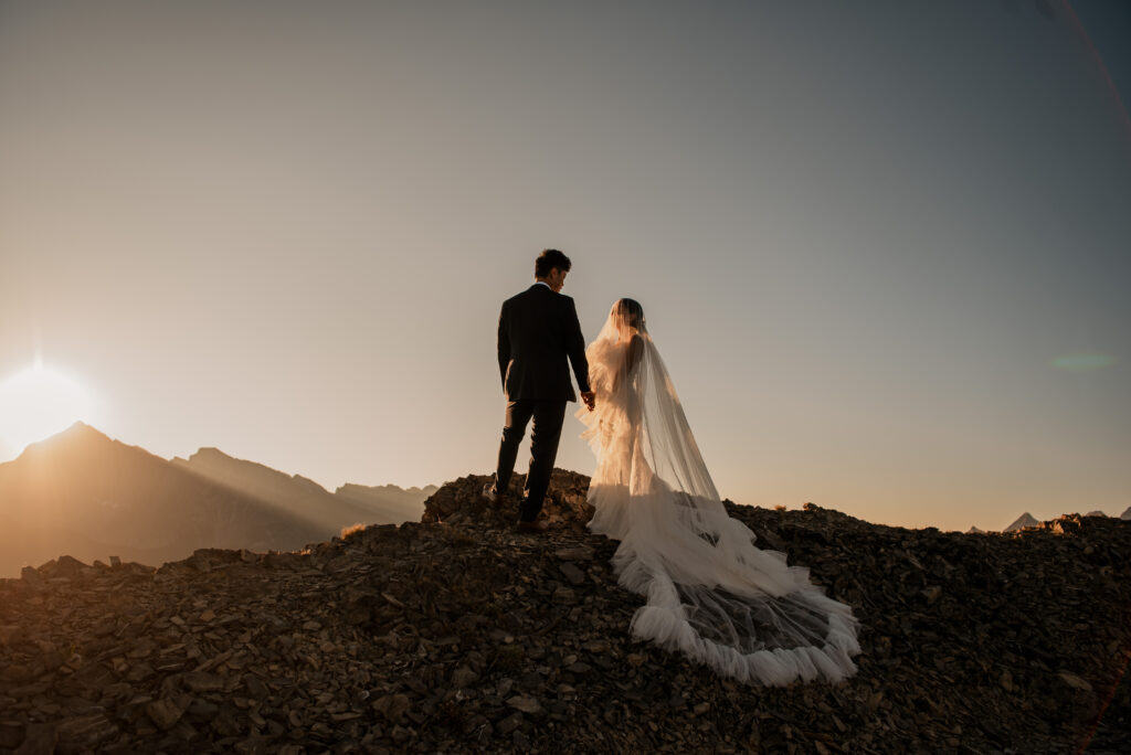 If you want to have a traditional wedding or lots of guests at a venue, that doesn’t mean you have to forfeit your epic mountain top wedding photos! This couple was having their actual wedding in China, but wanting photos on a mountain as well. So they chose to do sunrise hiking pre-wedding photos in Kananaskis! We actually ended up rescheduling this session due to miserable weather, but the morning that we did do the hike was insanely beautiful!